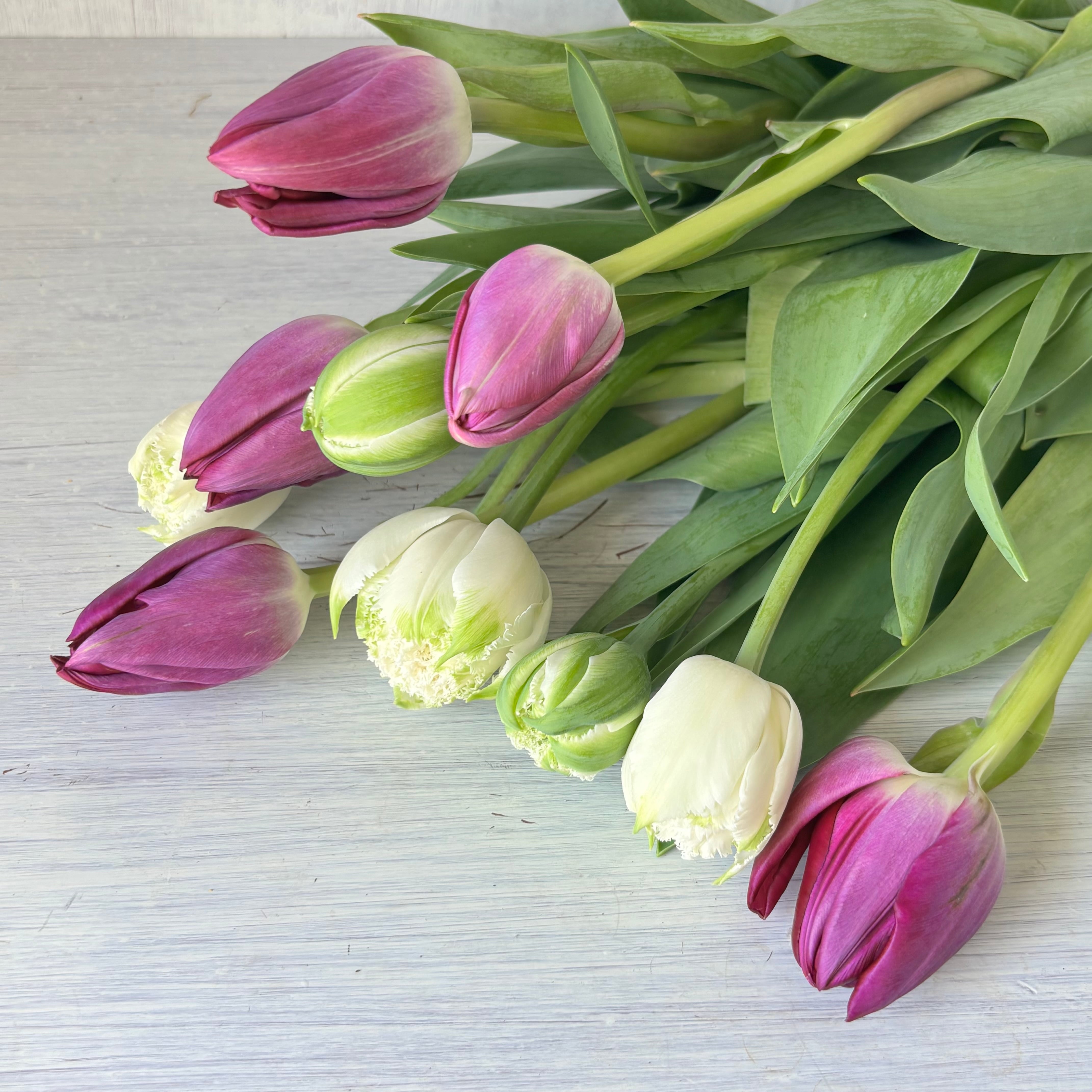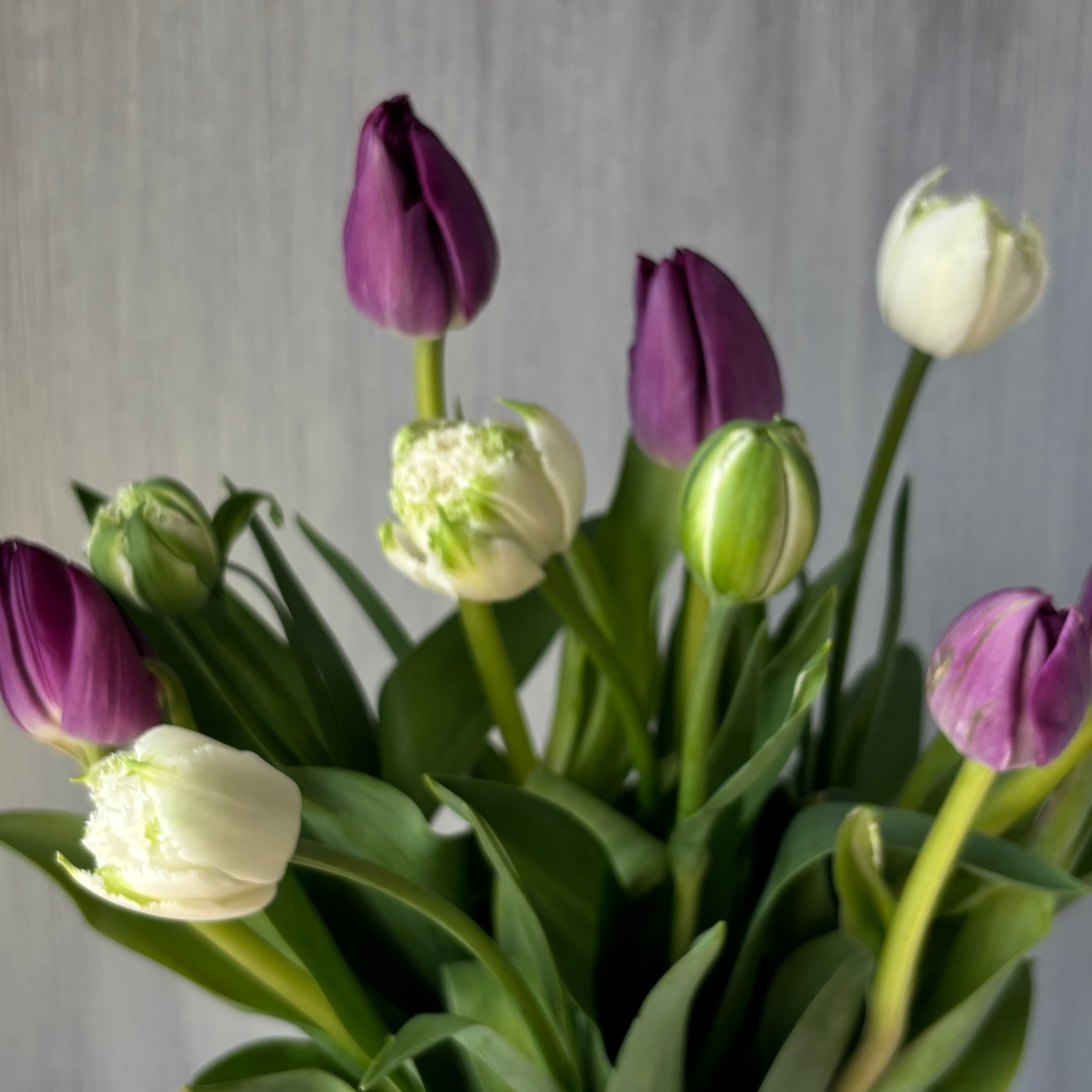 八重咲きのチューリップ パープルとホワイトのコンビでシックです。