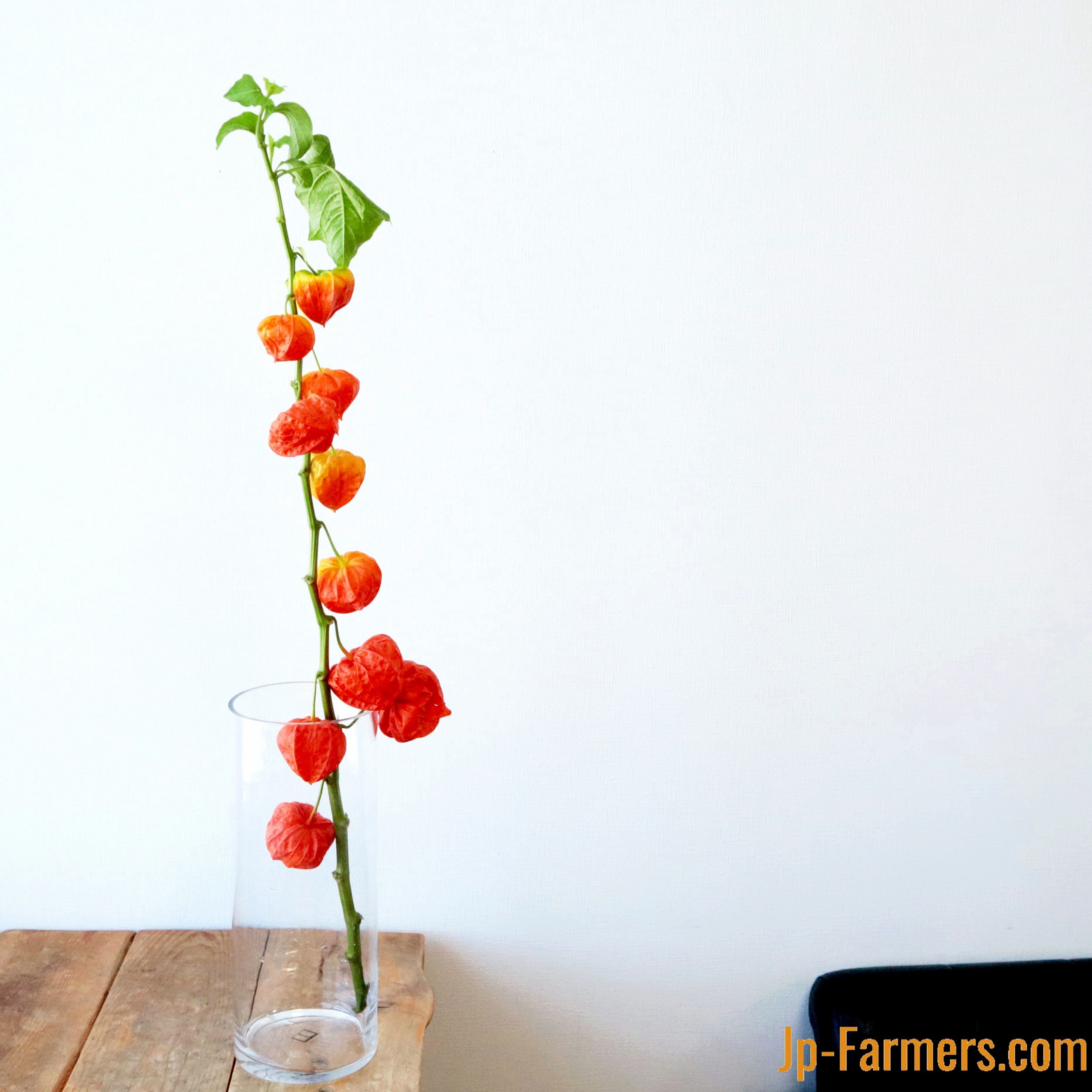 秋の作品やハロウィンに向けて作ってみると素敵なインテリアになりますよ。ホオズキの中に小さなライトをいれてナチュラルなランタンなどもやってみたいアレンジです。ホオズキの入荷は夏の短い期間だけなので、秋に使いたい方は今のうちにドライにして保管しておくことをお勧めします。