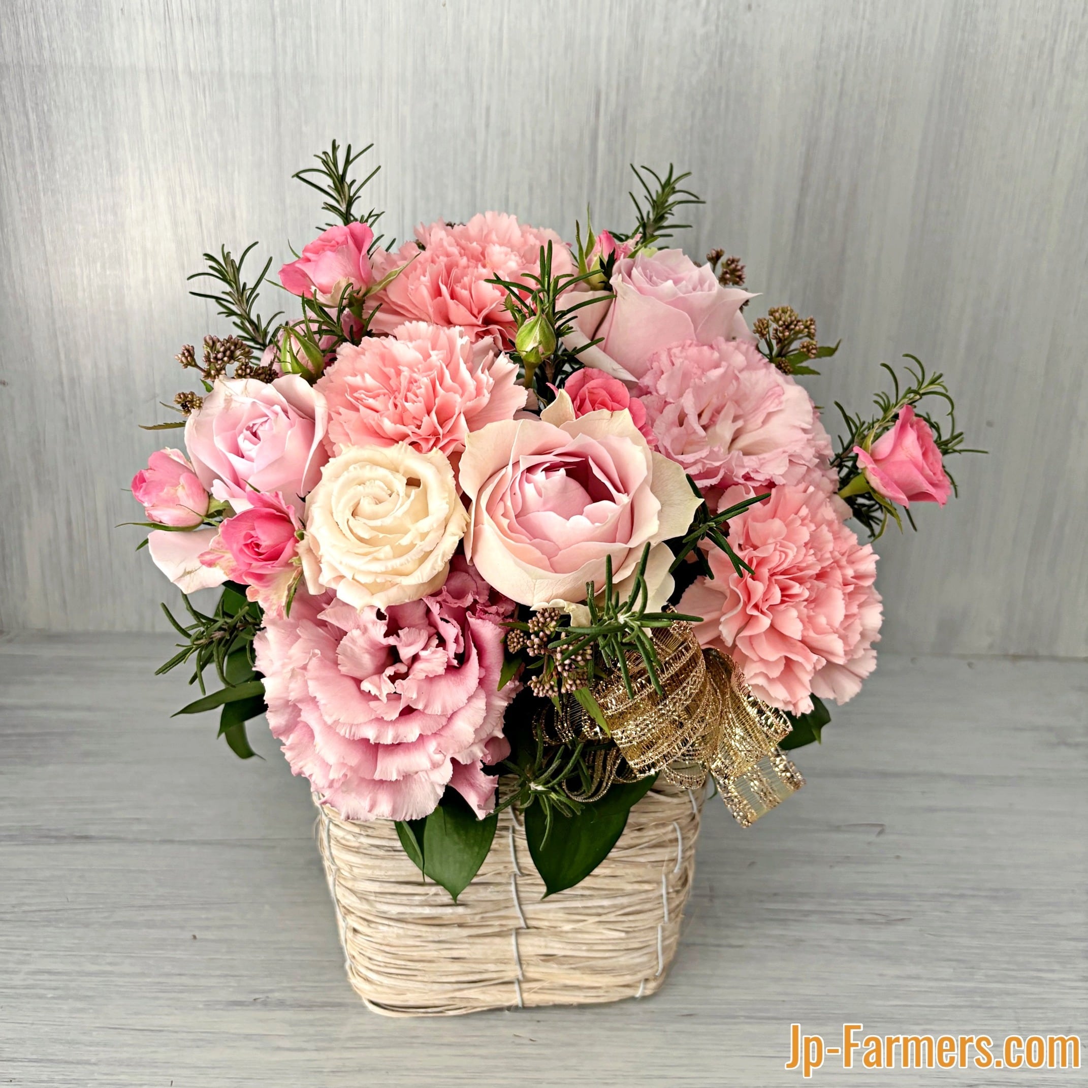 ピンクのバラやカーネーションをメインに小花やグリーンでまとめ、そこにハーブのローズマリーを加え、香り高く上品さと可愛らしさのあるアレンジメントです。