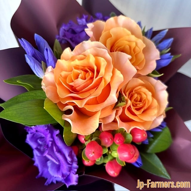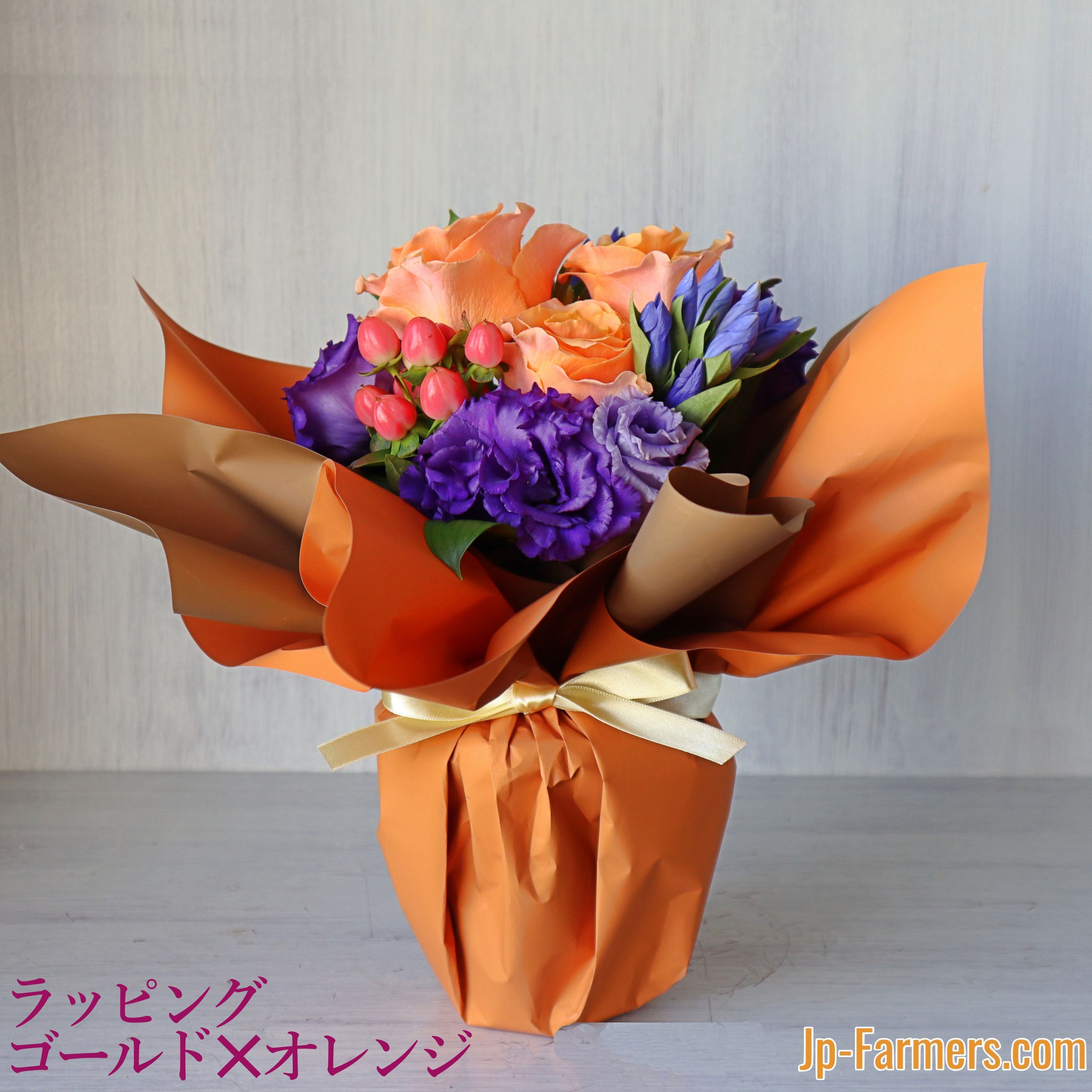 バラには、しっかりしたフリルの花弁と鮮やかなオレンジ色をした「カルピデューム」を使用。花持ちも良く、青紫のリンドウやトルコキキョウとも相性抜群。