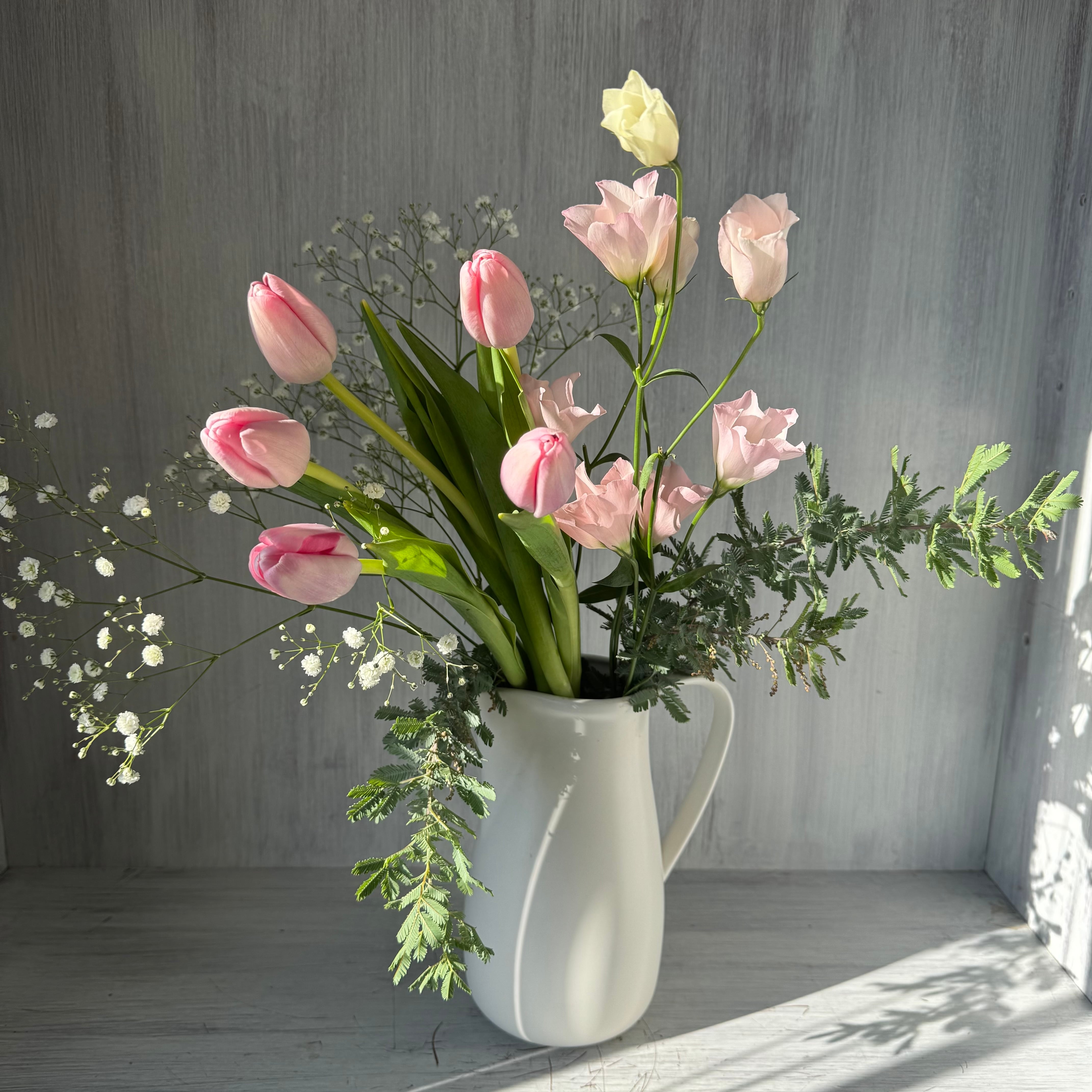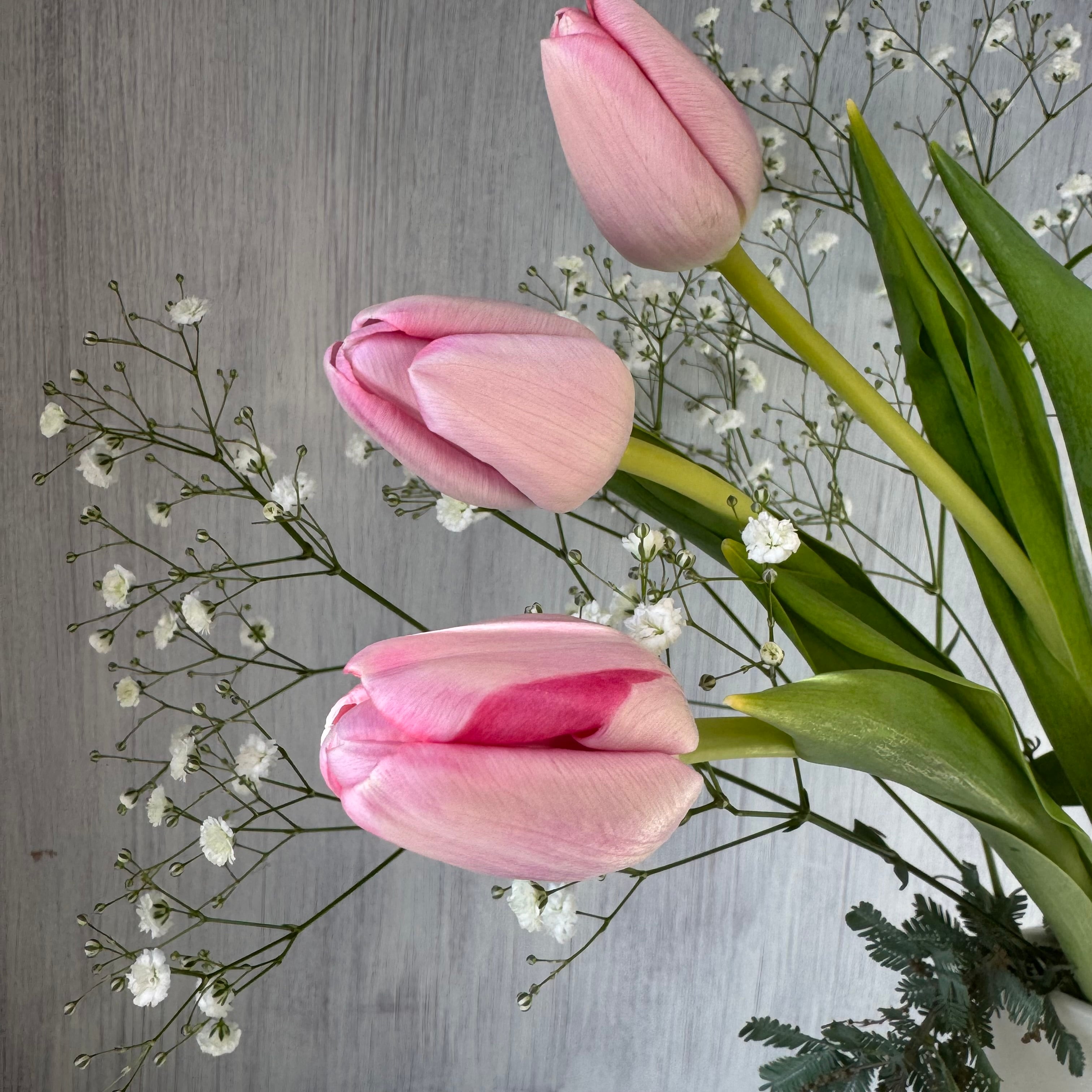 気軽に飾れるミニブーケです。ピンクチューリップとピンクの花材でまとめた可愛いく優しいミニブーケ。チューリップは茎がぐんぐん成長するので長く楽しめます。