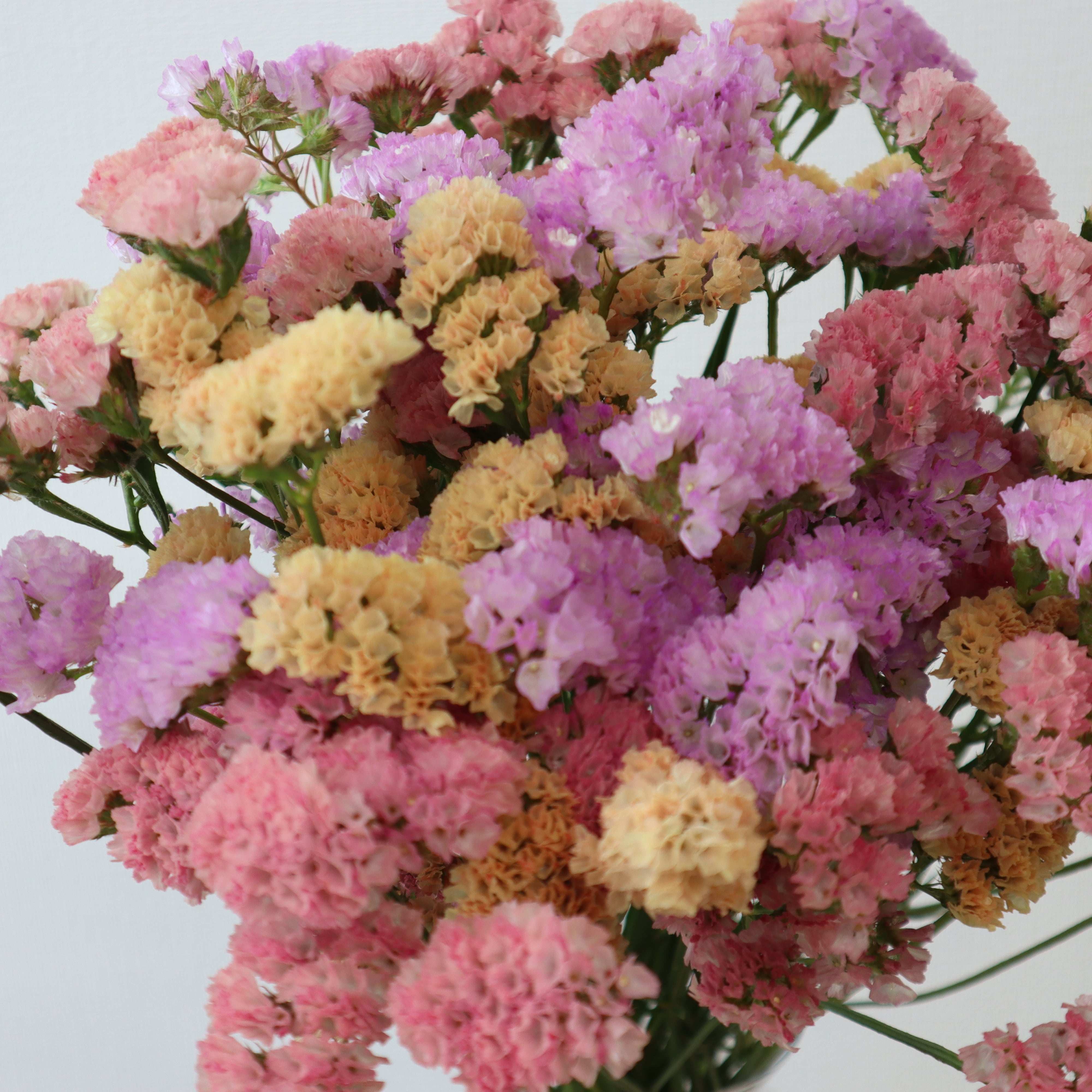 スターチスは別の呼び名で「リモニウム」や「ハナハマサジ」とも呼ばれている、花茎の先に白や黄色い小さな花を咲かせます。花びらのような姿のがくは青、紫、黄、ピンク、白など色鮮やかで、スターチスはがくの方が花びらよりも目立っている特徴があります。