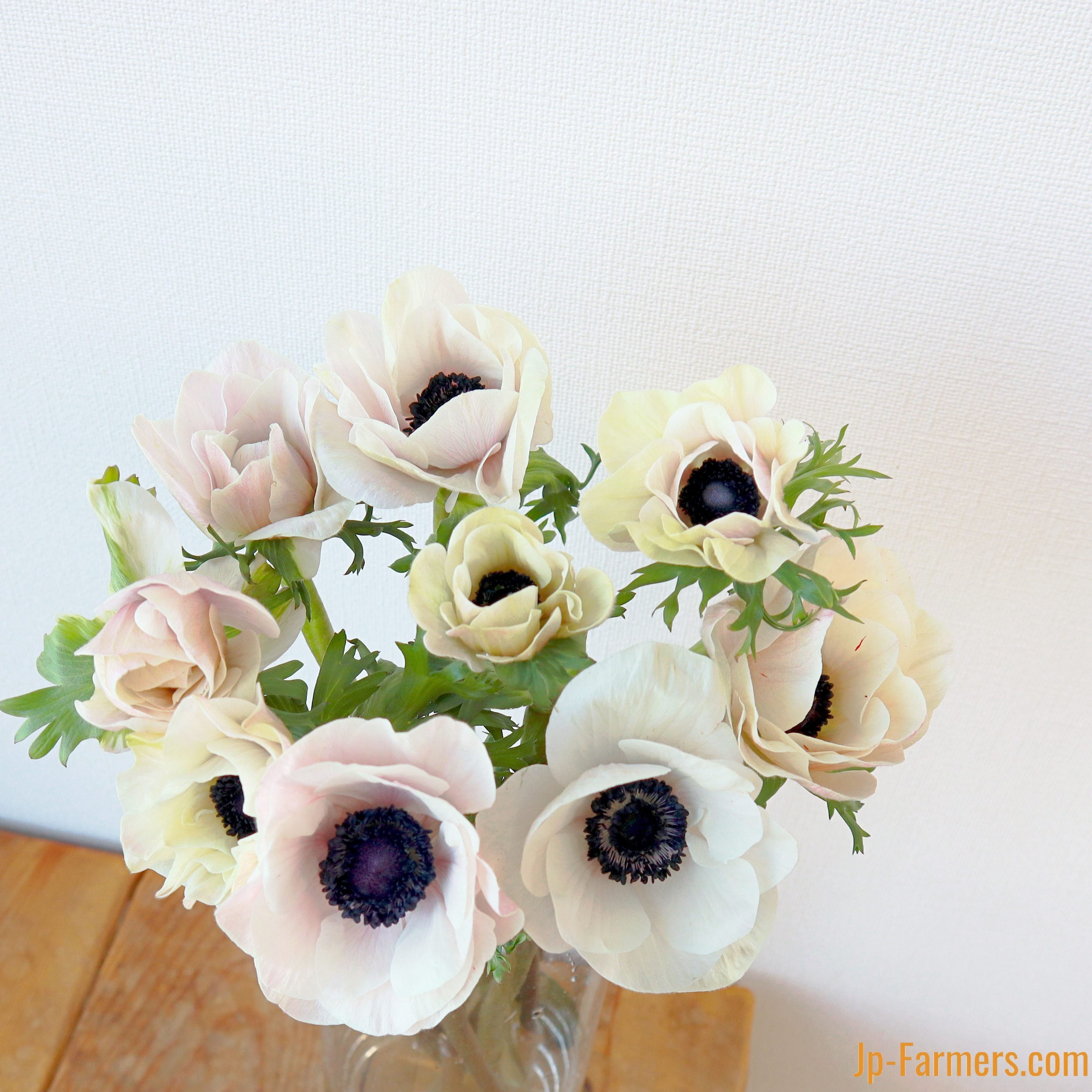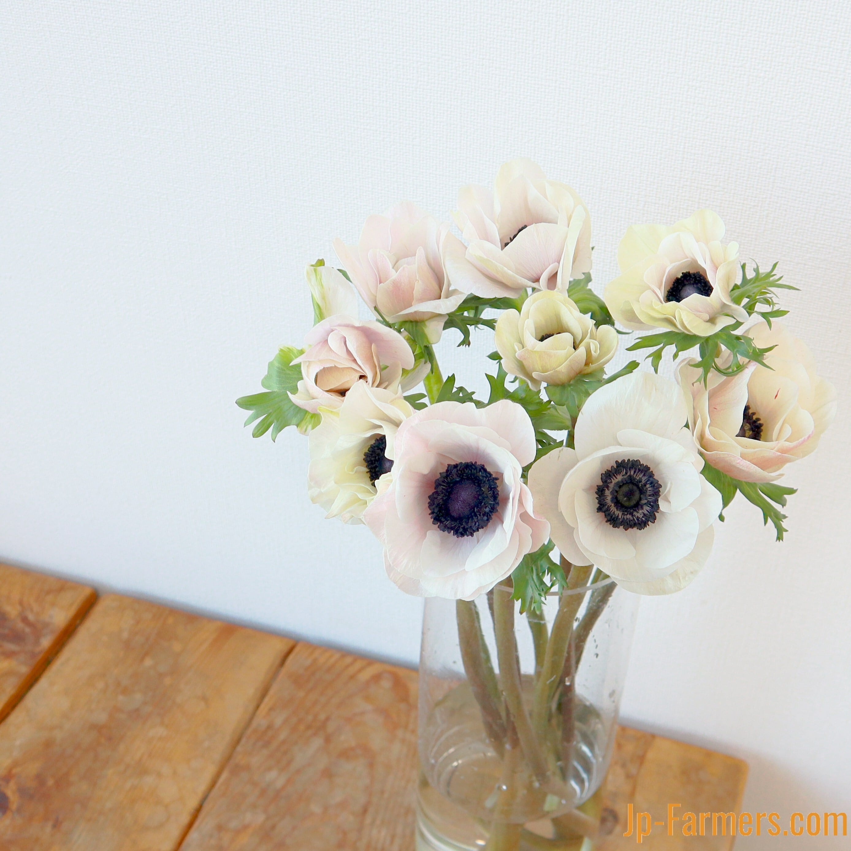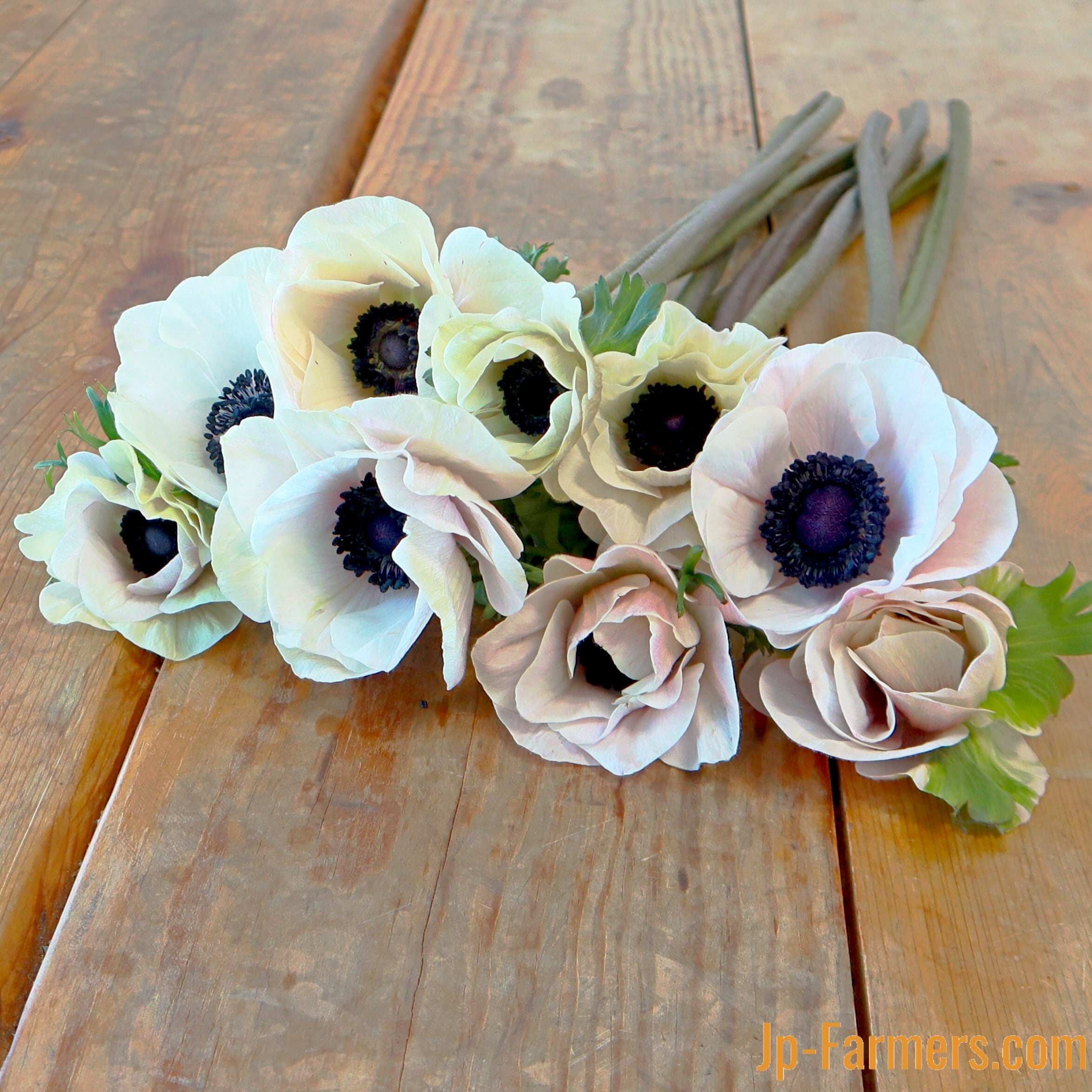 アネモネのミストラルシリーズ(大輪系)の品種になります。茎太めでしっかりしておりますが、とても繊細な色をしております。花弁は真っ白ではなく、サーモンピンクが入っており、芯黒とのコントラストが魅力です!!ブライダルのお花として大変人気があり、重宝されるいる品種です。