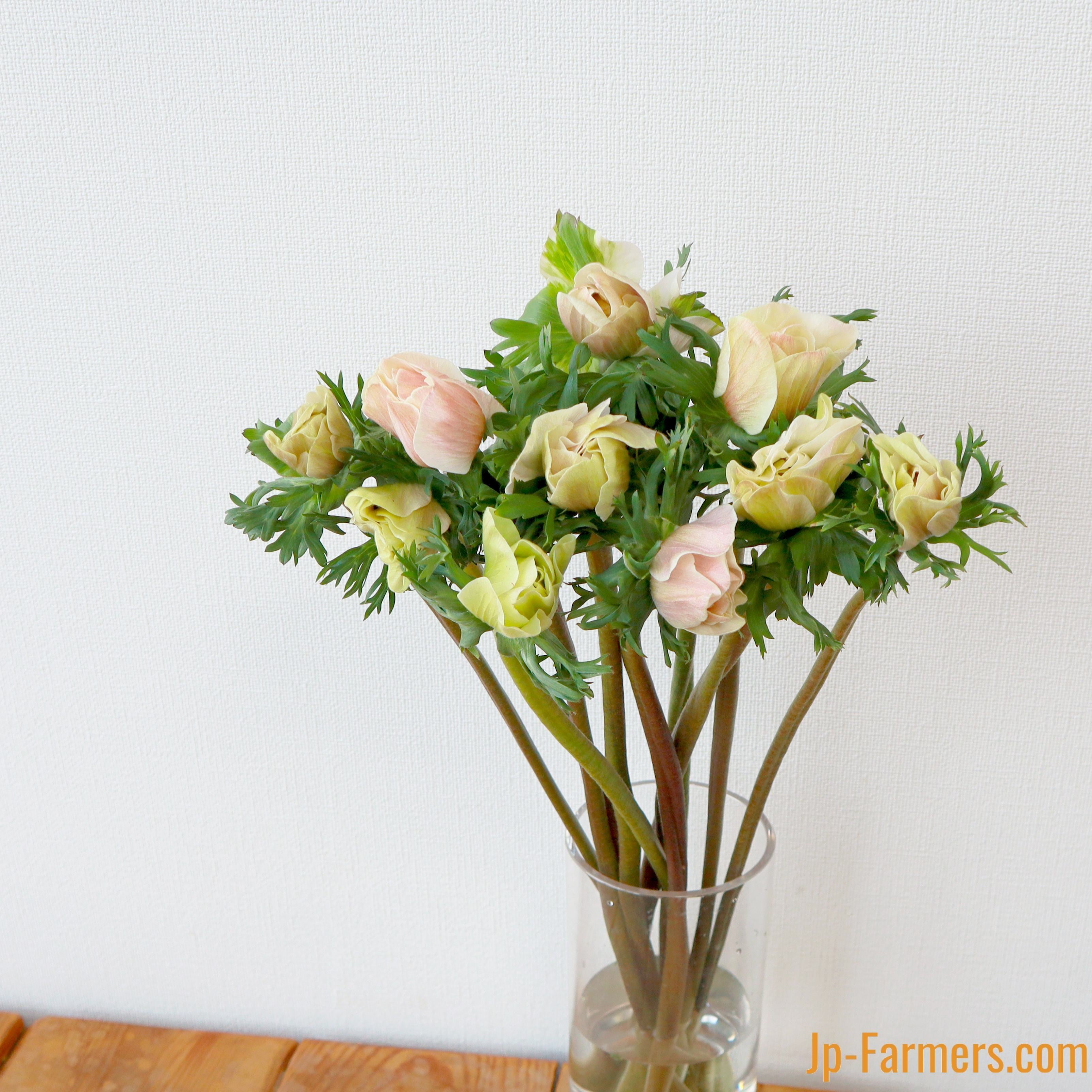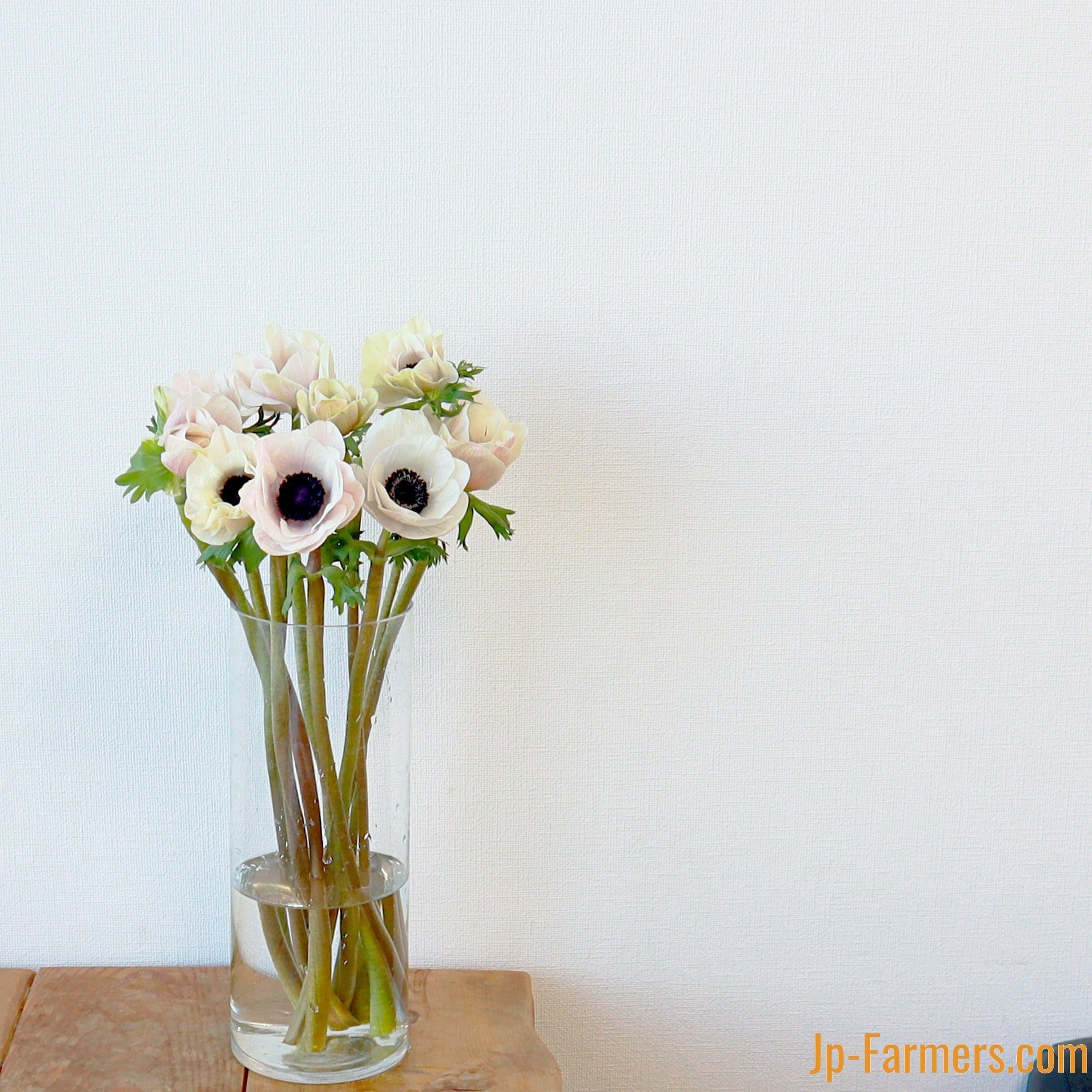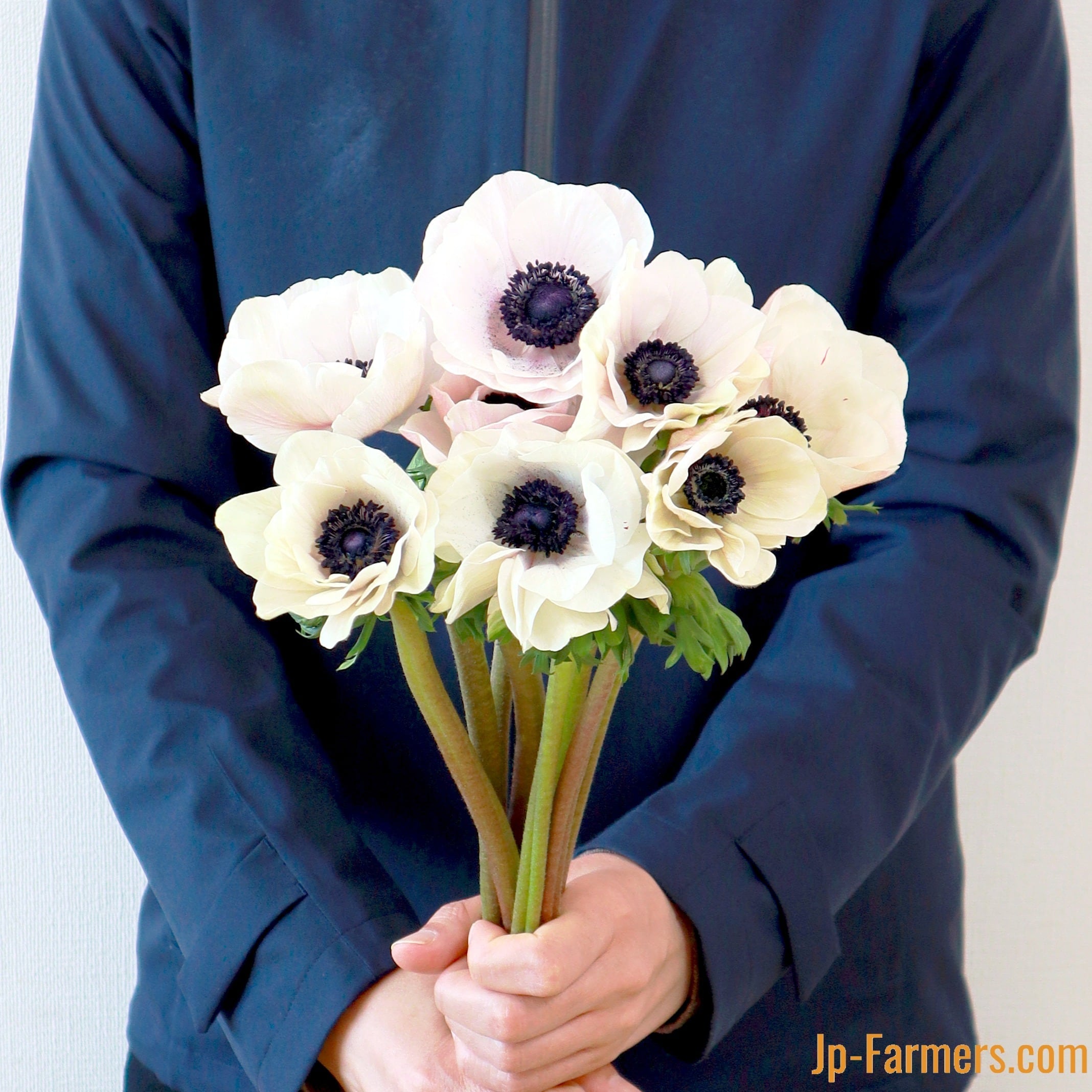 アネモネのミストラルシリーズ(大輪系)の品種になります。茎太めでしっかりしておりますが、とても繊細な色をしております。花弁は真っ白ではなく、サーモンピンクが入っており、芯黒とのコントラストが魅力です!!ブライダルのお花として大変人気があり、重宝されるいる品種です。