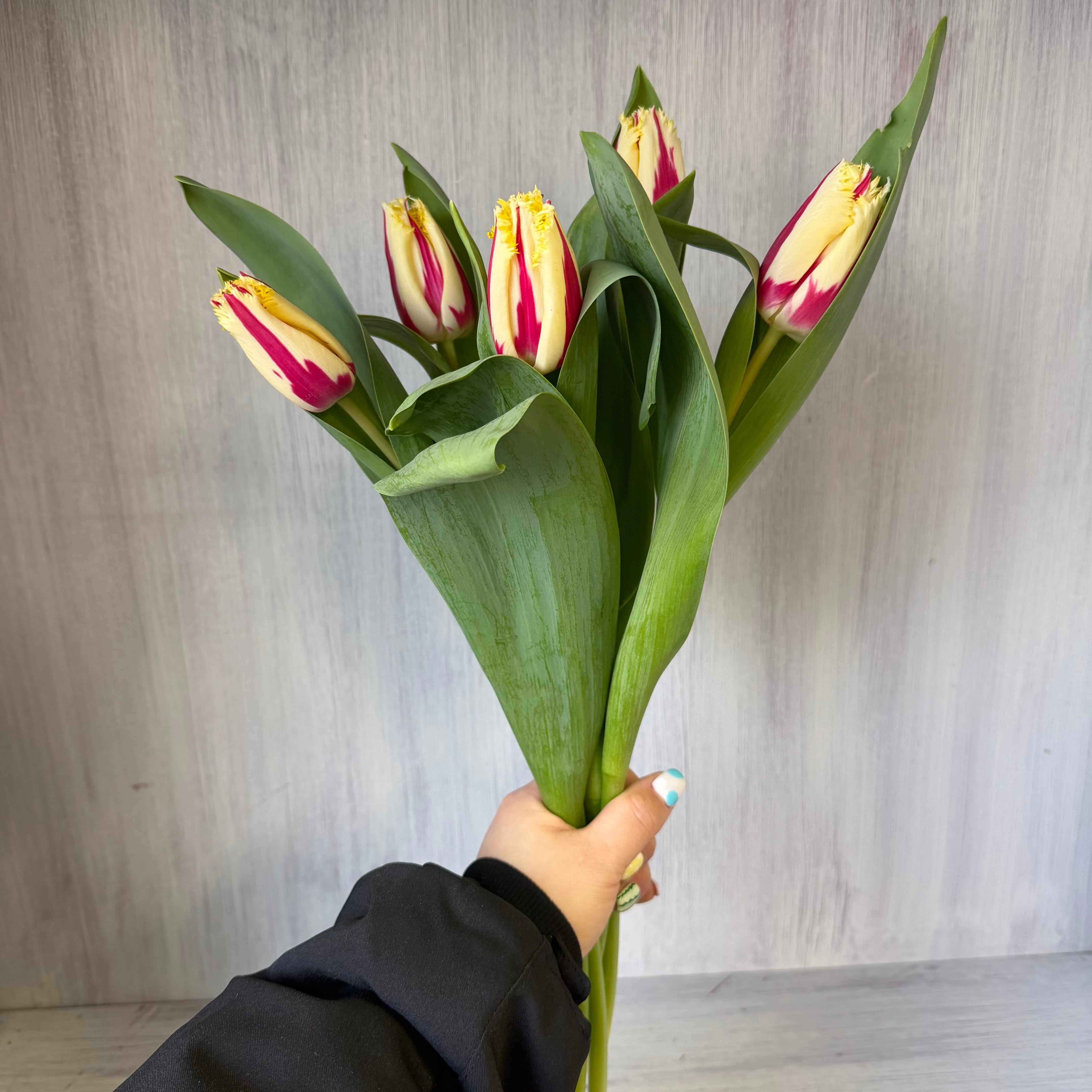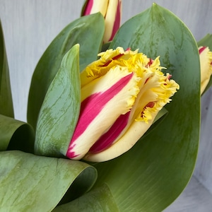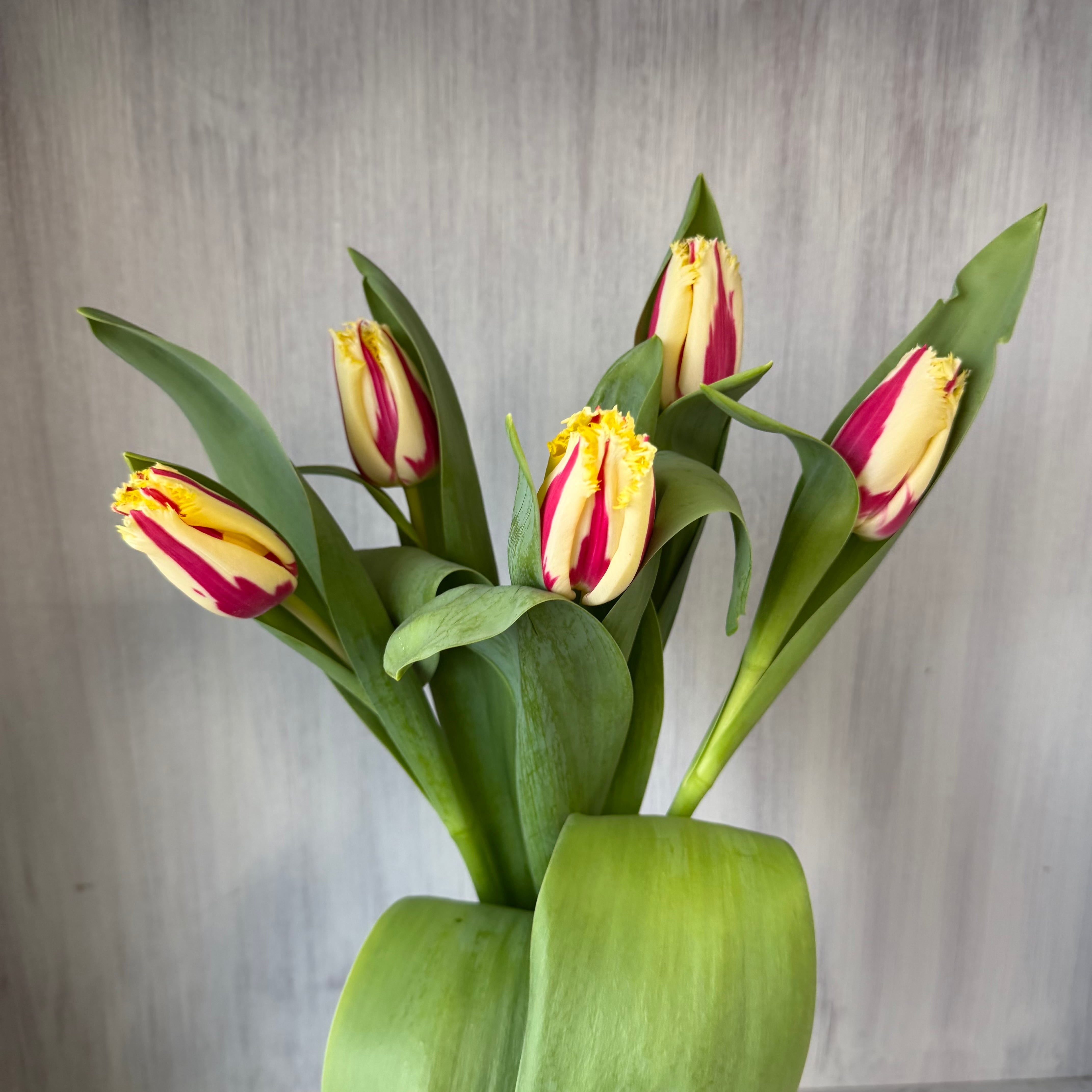 フリンジ咲きのチューリップ。キュートな赤と黄色のコンビネーションに花弁先にフリンジが効いたエッジある品種です。生産数の少ない希少性ある高級品種なんです。