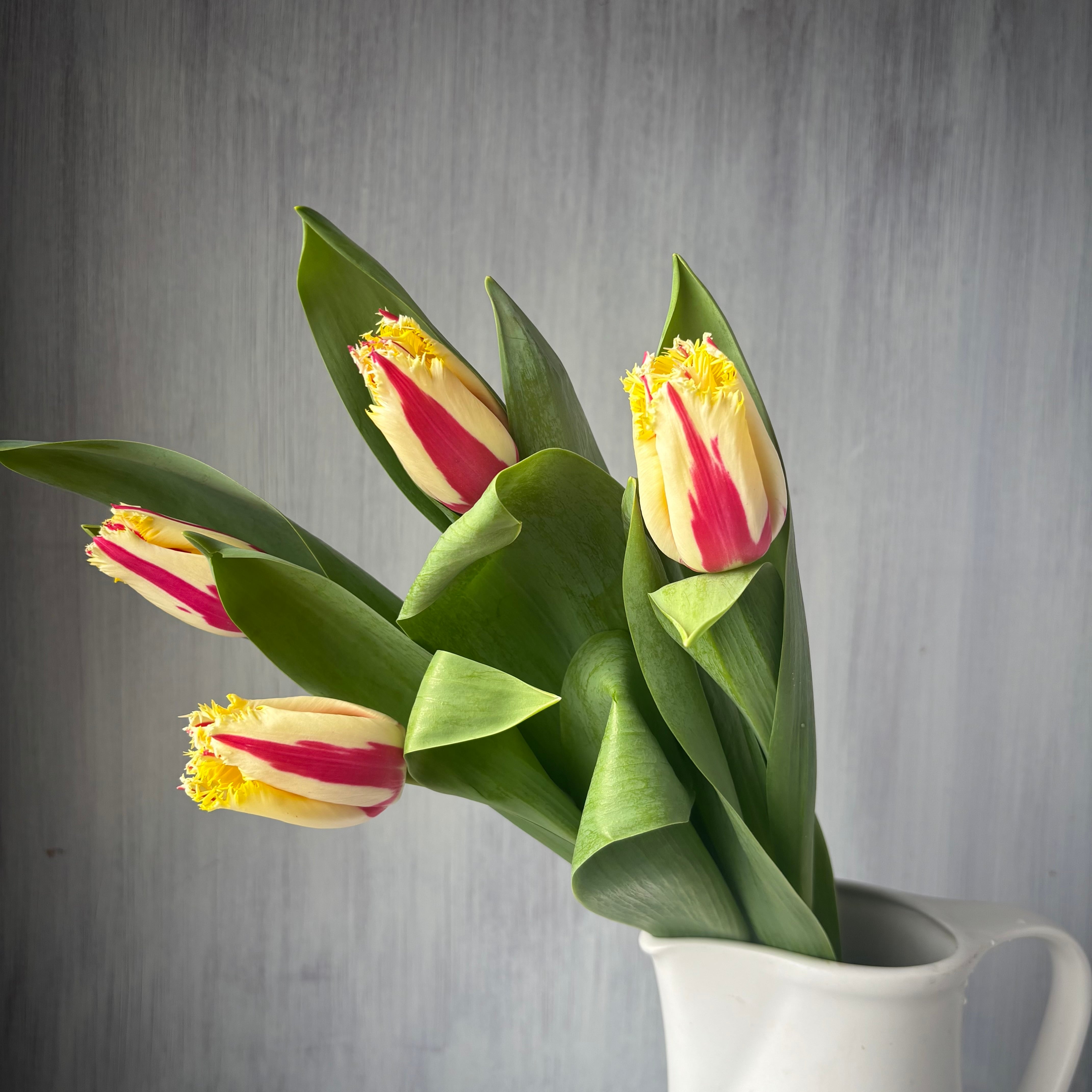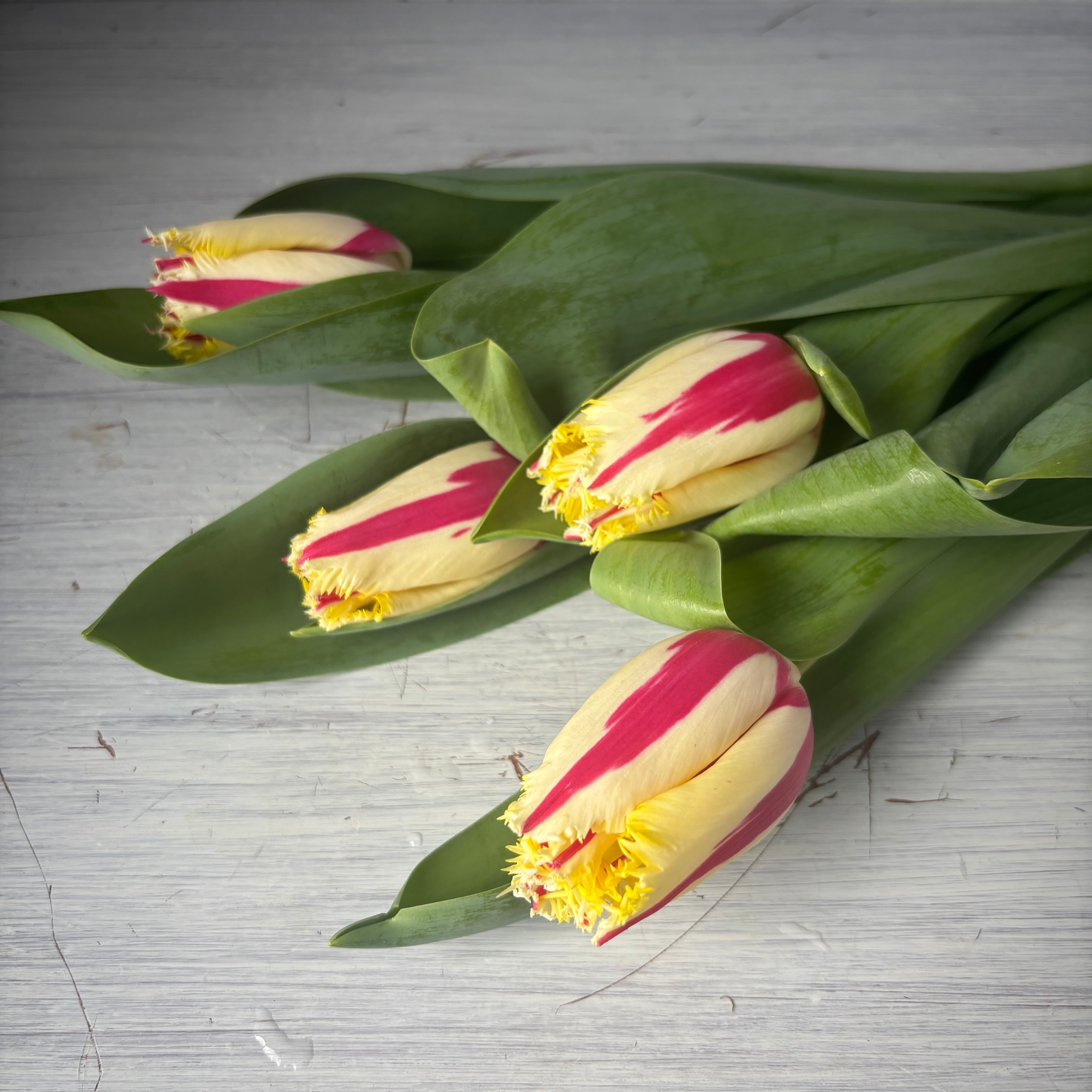 フリンジ咲きのチューリップ。キュートな黄色と赤のストライプ。元気なこのコンビネーションに花弁先にフリンジが効いたエッジある品種です。生産数の少ない希少性ある高級品種なんです。