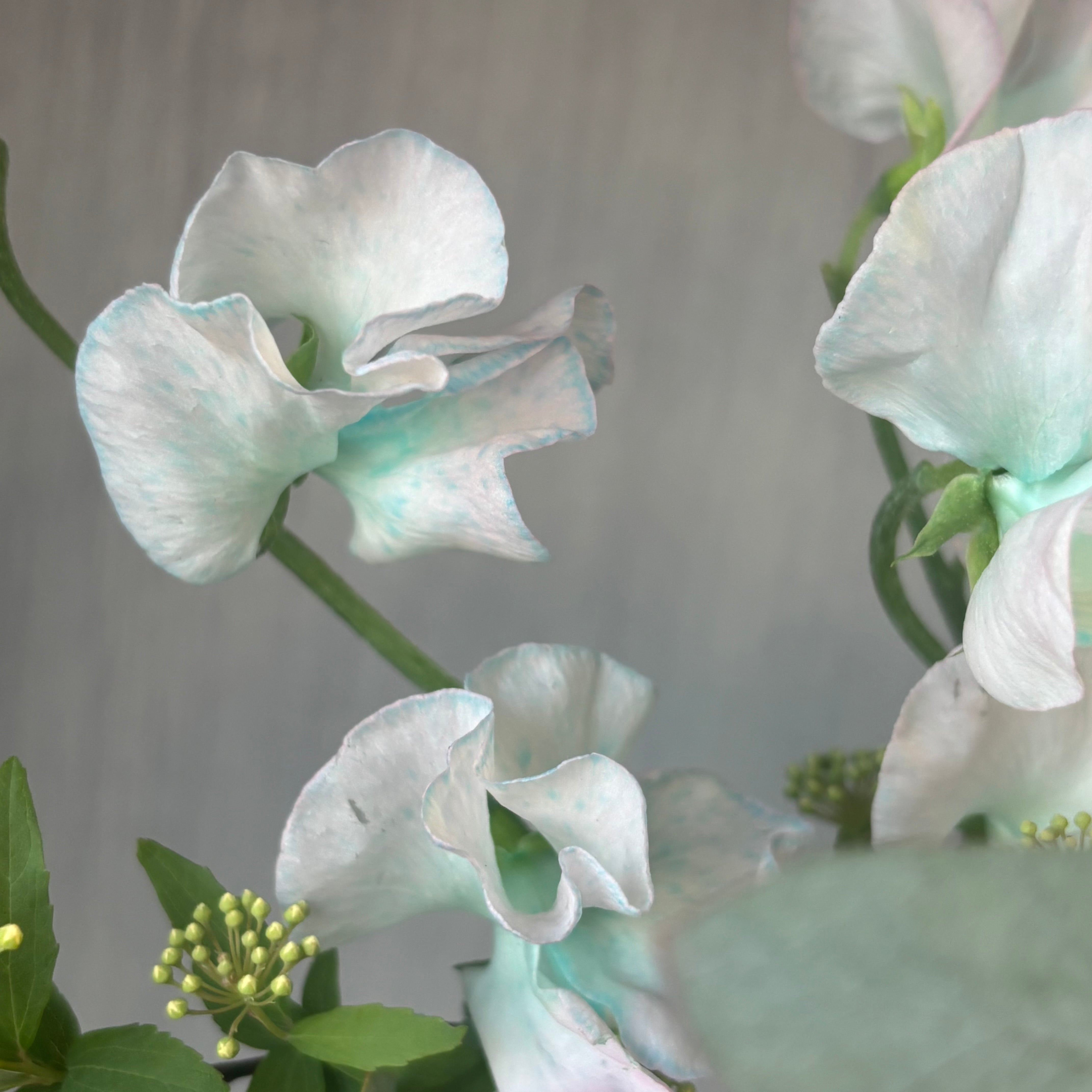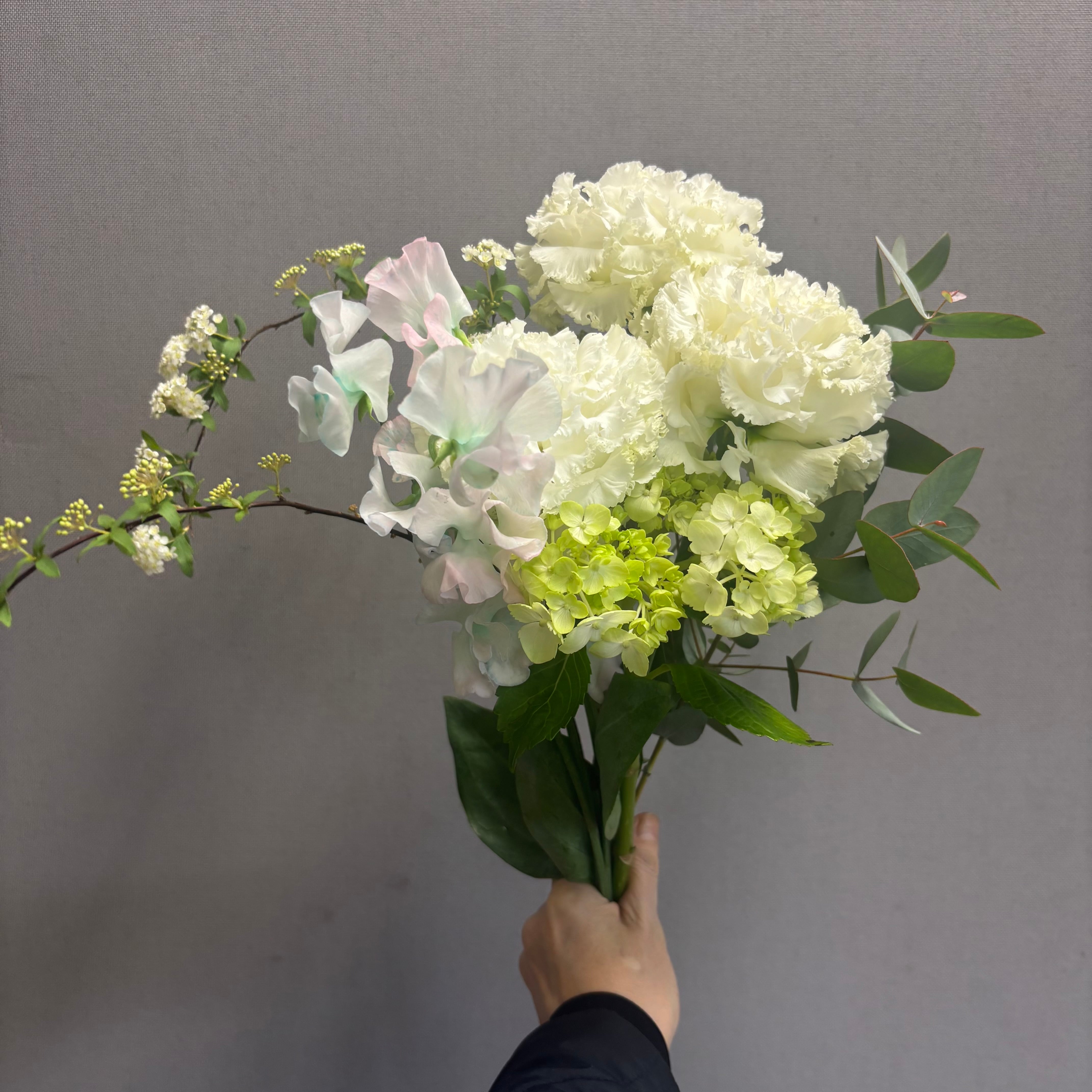本数 トルコキキョウ 3-4輪、ミニアジサイ 1本、スイートピー 3本、コデマリ1-2本(枝ぶりによってボリューム調整します)、ユーカリ2本