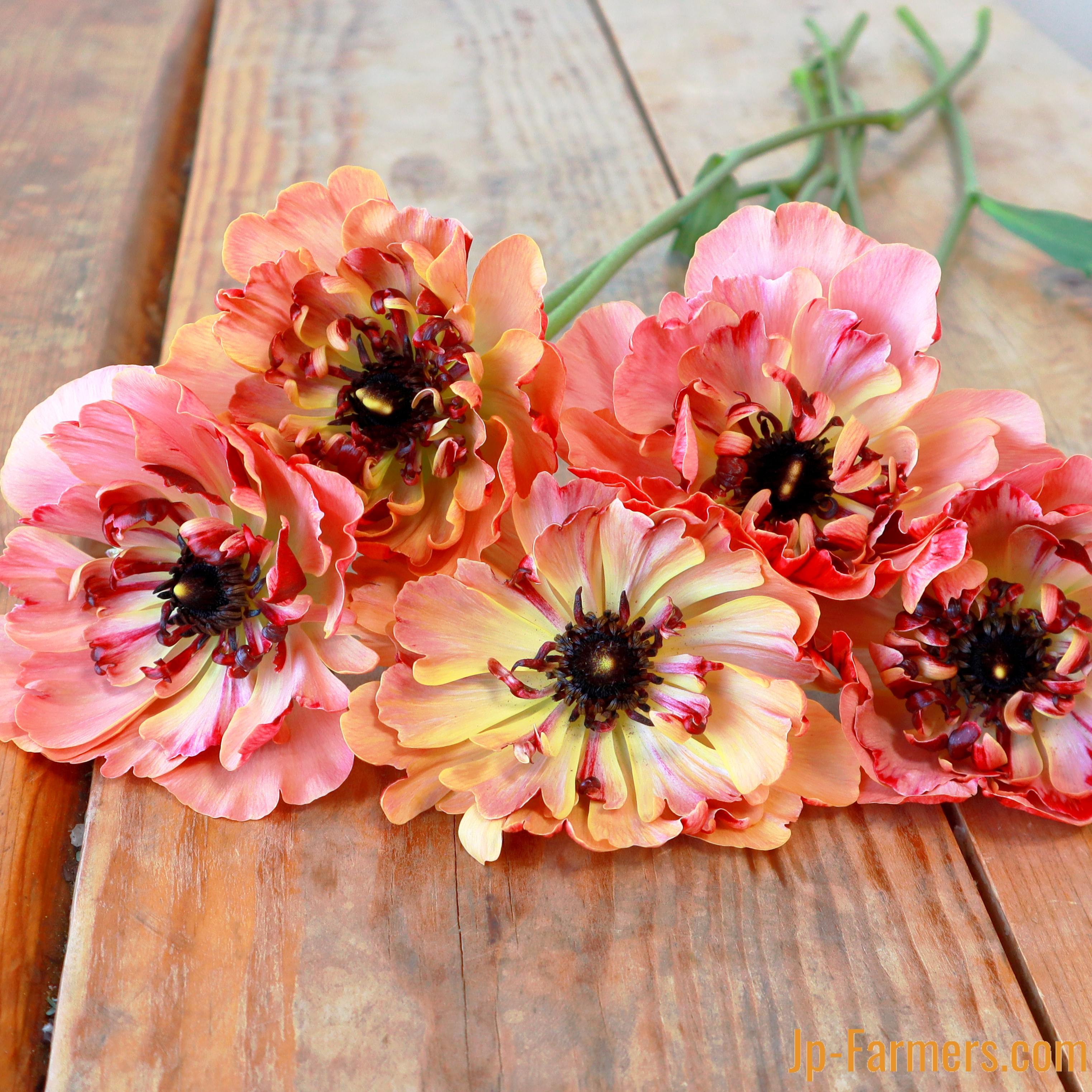『シャルロット』は一風変わった形のラナンキュラス。切れ込みの入った花びらとアネモネのような黒い花芯が個性的でおすすめです。