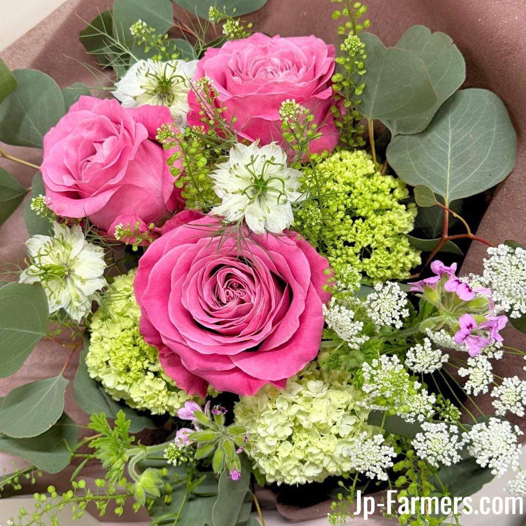 ピンクの薔薇の花言葉は「感謝」。大輪のピンク薔薇を主役に、グリーンをふんだんにつかった贅沢なブーケです。ラッピングしてお届けです。