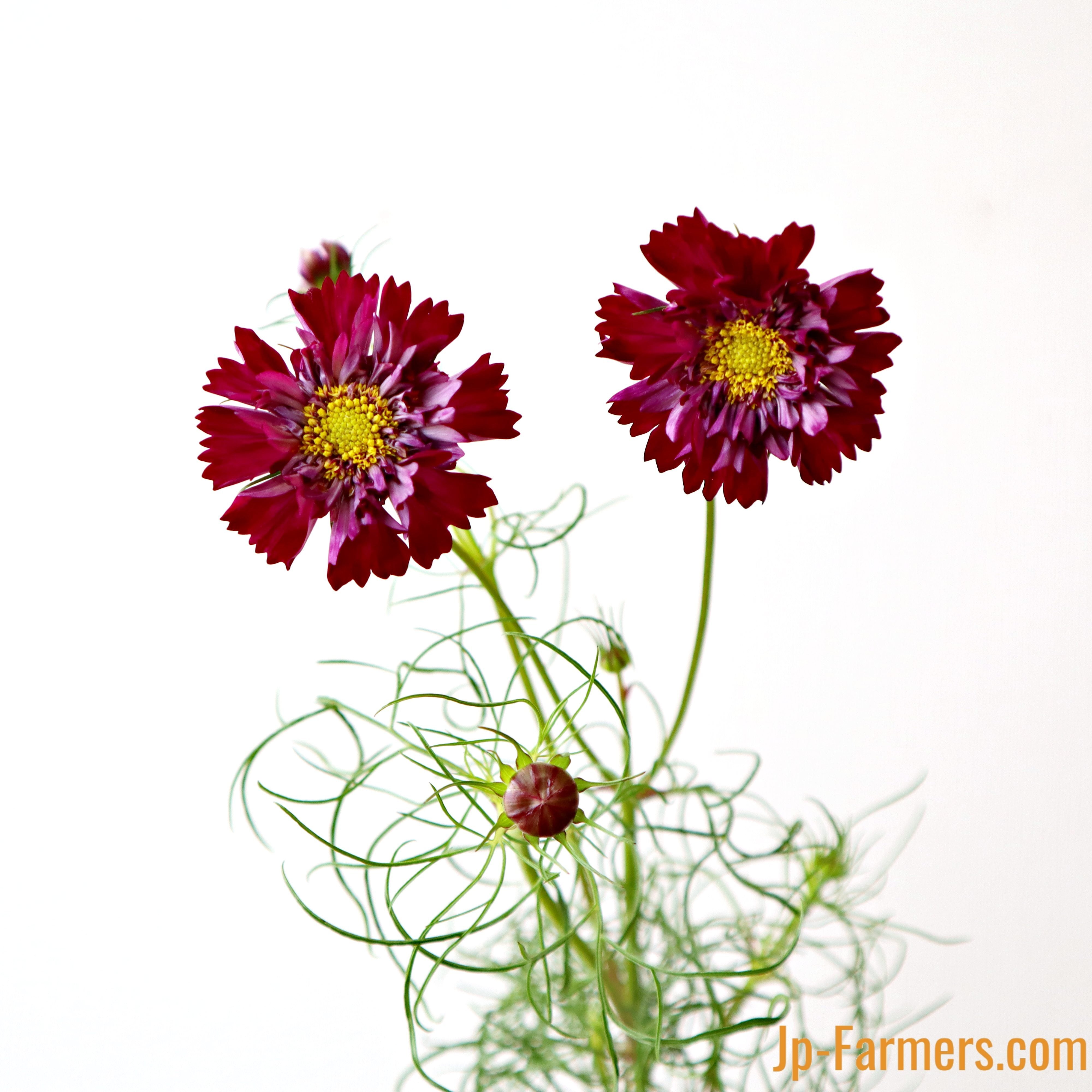 ダブルクリックシリーズの深紅にほど近い濃いピンクの品種。見え方によっては、深紅やパープル、ブラウン、ピンクのシックな秋桜です。花弁が特徴的で、ギザギザとした先と、くるんと裏返ったような形状のものもあり色が裏表で楽しめます。