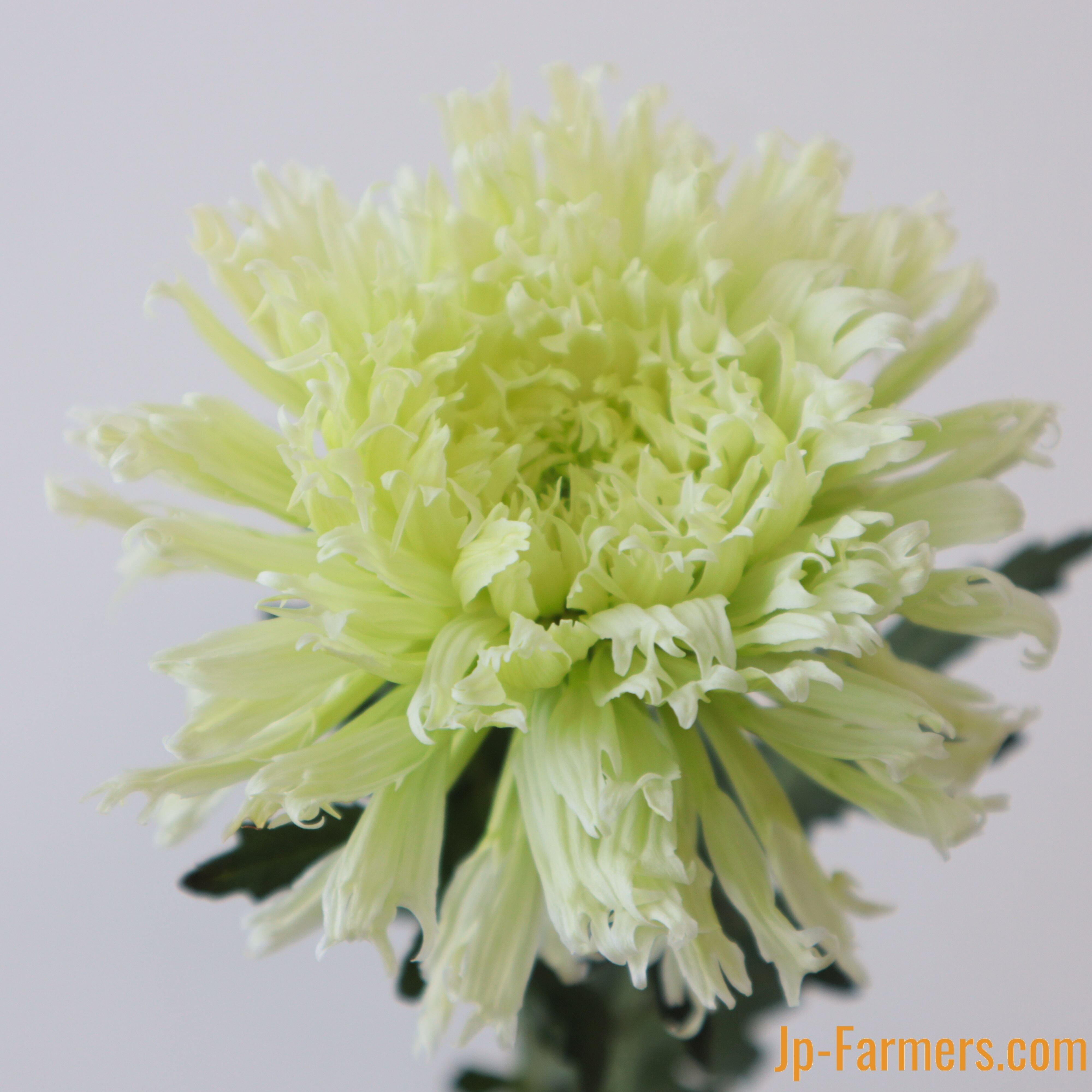 ライトグリーンのスパイダー咲きのマム。ストロー状に細く長く伸びた花弁に、先端に切り込みが入り、イレギュラーにカールすることで波打つような豊かなボリュームと華やかさを生み出しています。ひらひらと躍動感があり、優しいライトグリーンの色が爽やかなマムです。