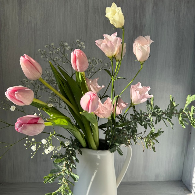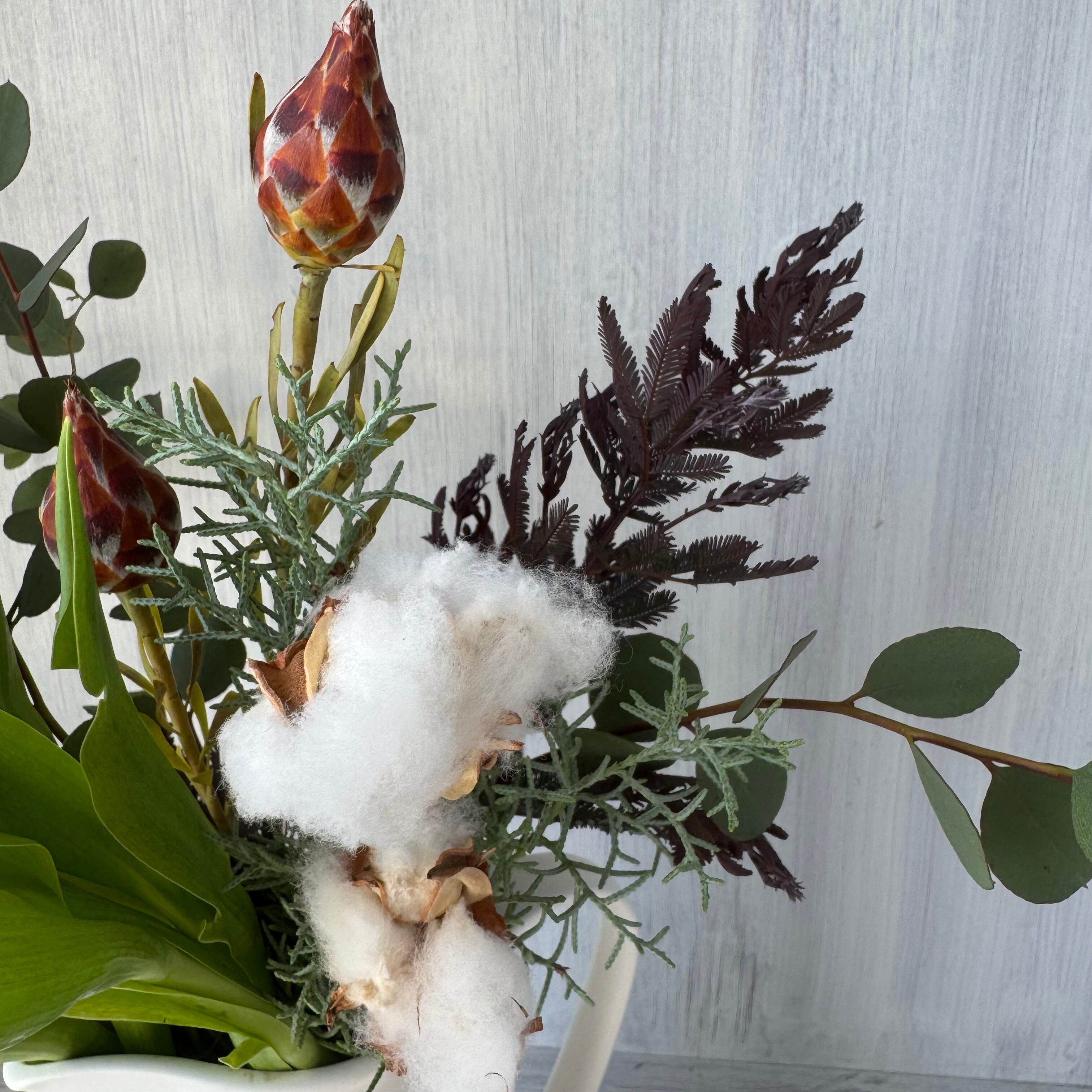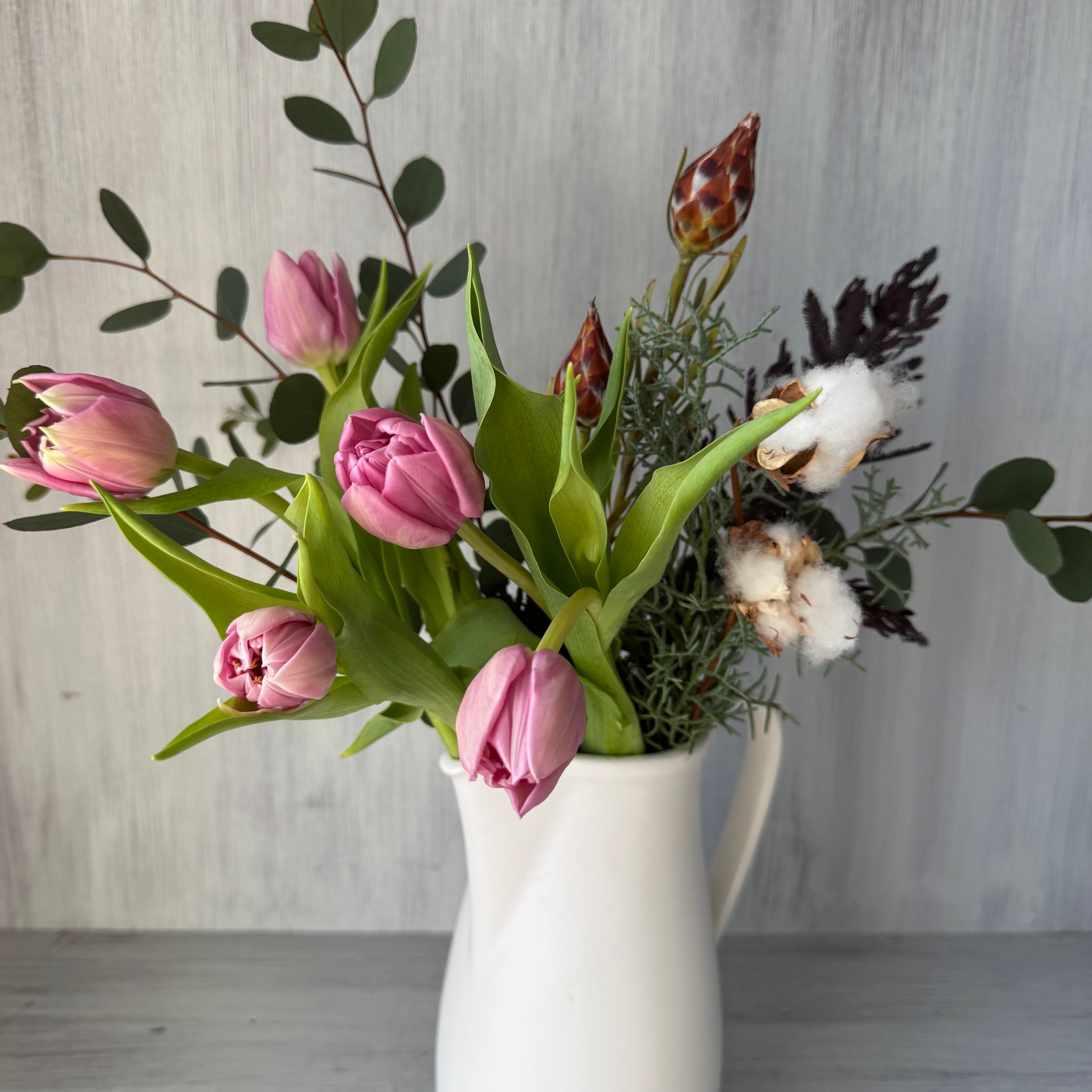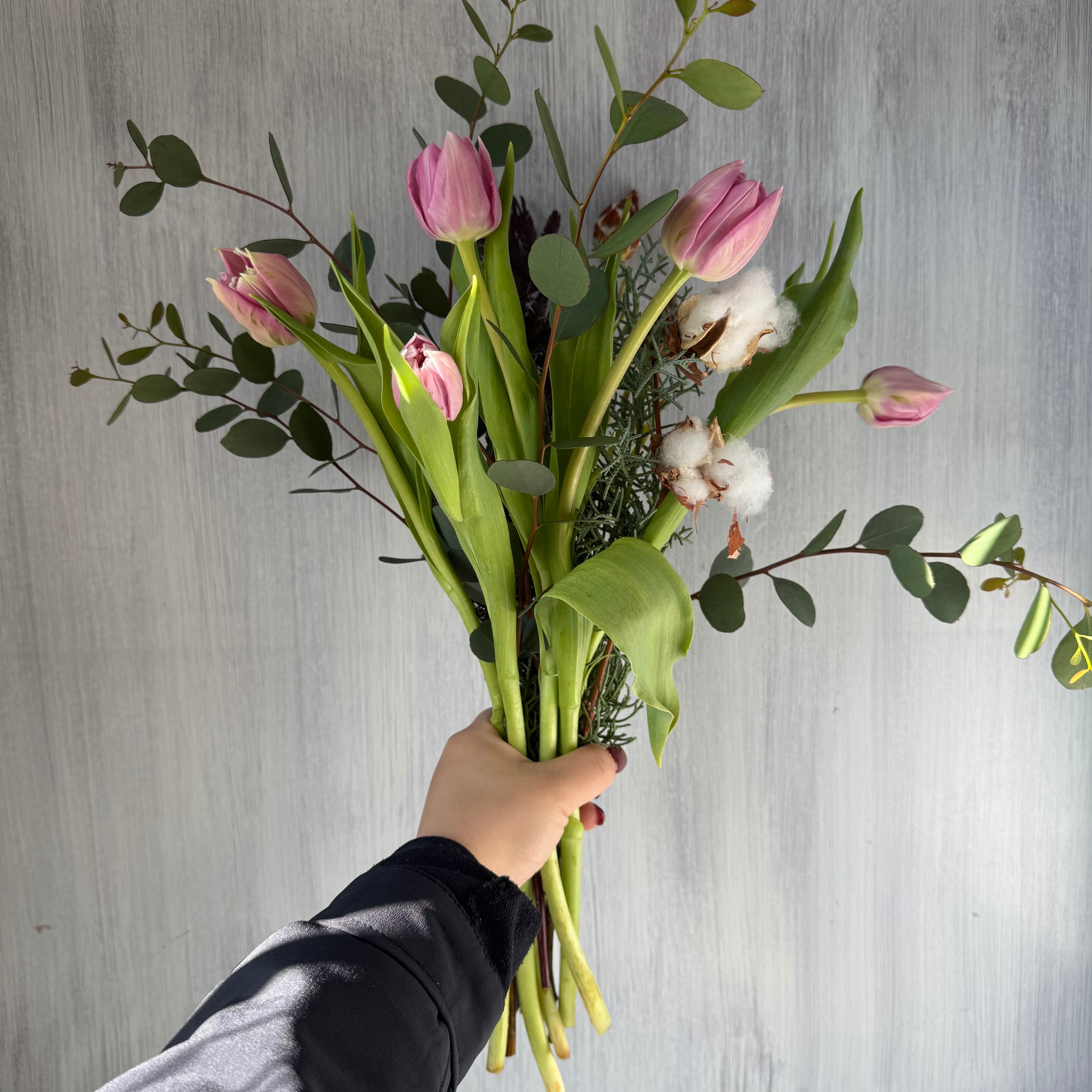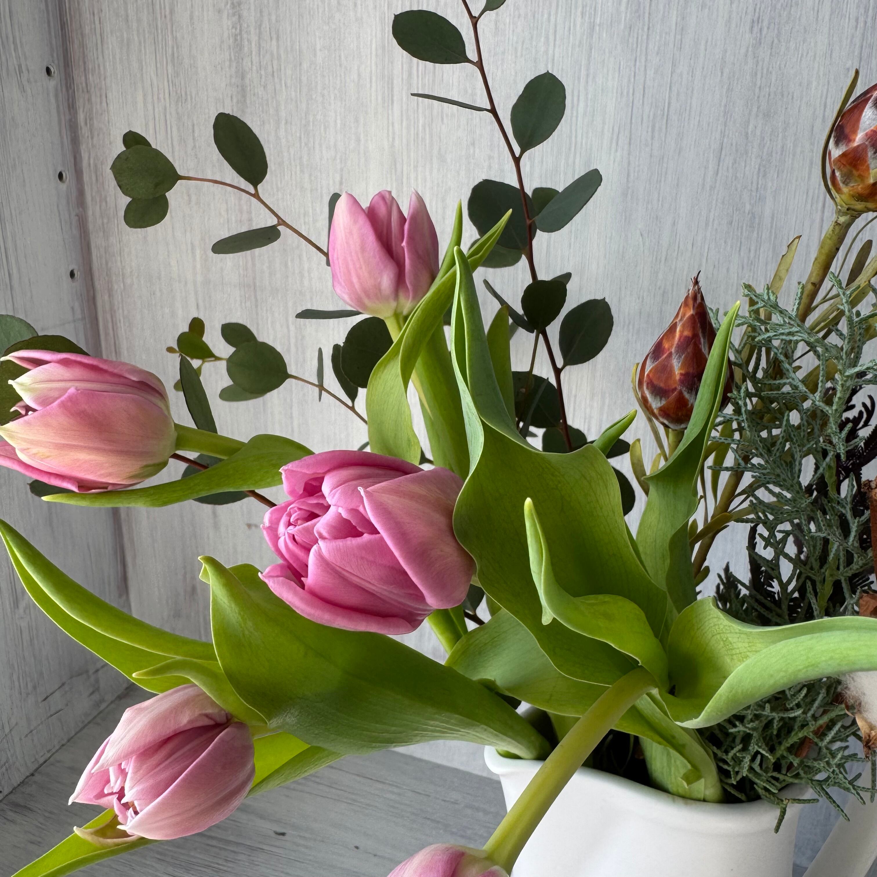 チューリップ5本、コットンツリー 1枝、ブルーアイス 1本、リューカプルモーサム 1本、ユーカリ 2本