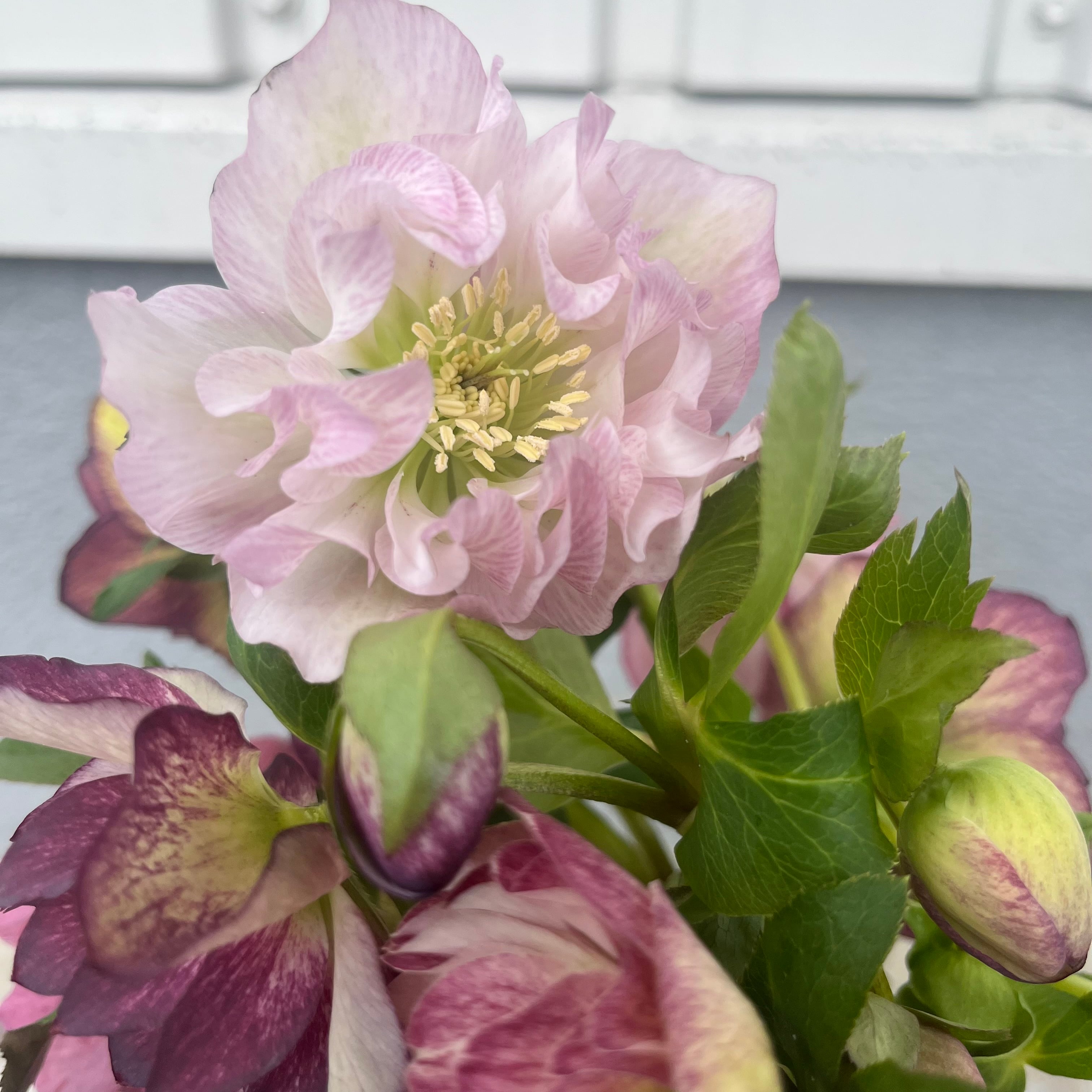 クリスマスローズはうつむく健気さに惹かれる人気のお花。こちらは八重咲きです。