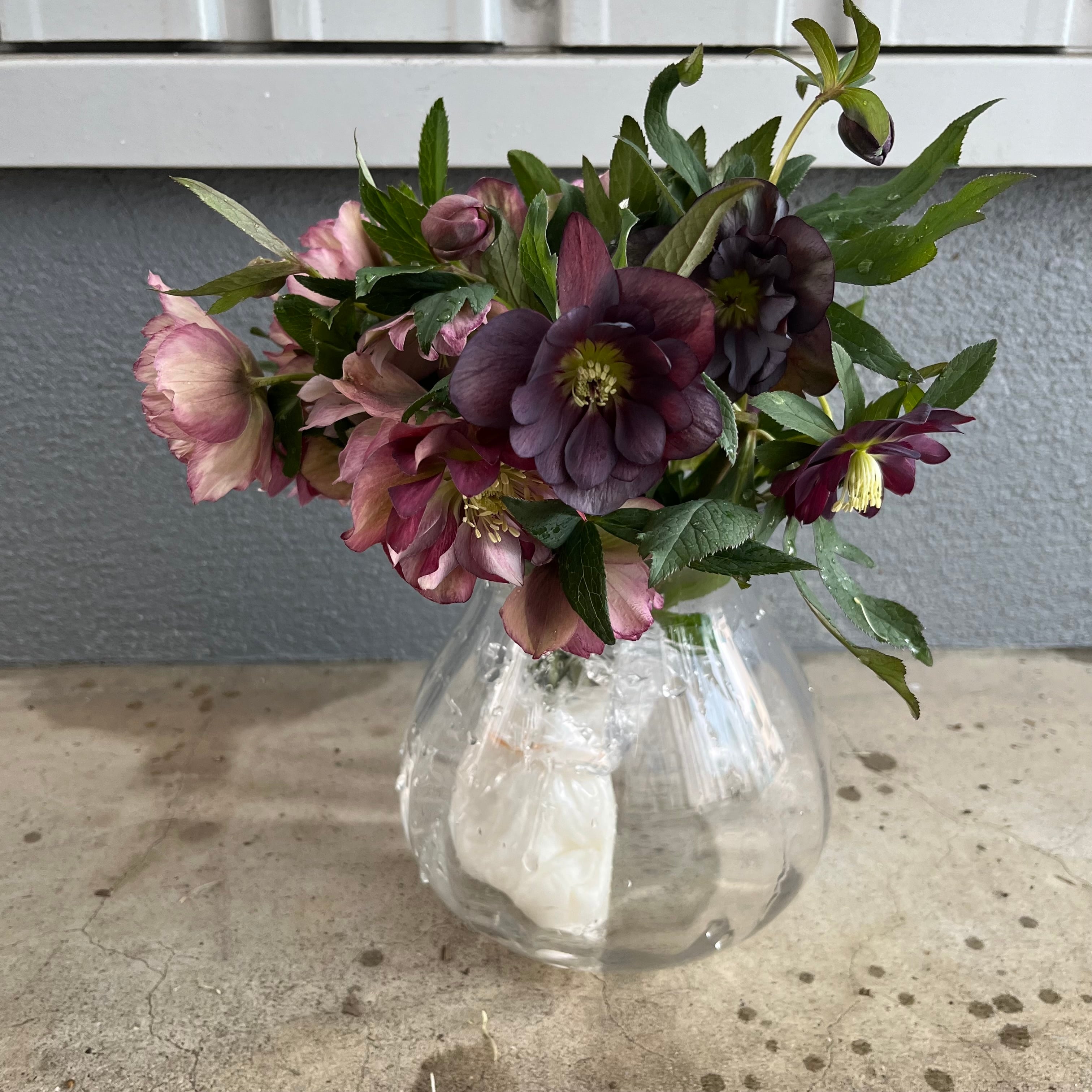 クリスマスローズは、できるだけ深く生け込むことが大事ですので、花柄全体が水に浸かるサイズの花瓶で飾ります。