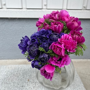 アネモネというお花は丈が30-40㎝程のミニサイズのお花です。小さな花瓶に生けれる可愛らしいお花です。アネモネは先が細かく裂けたような形状の葉を持ち、葉の間から伸びた花茎の先に1輪の花を咲かせます。花びらは放射状に開き、中心には多くの雄しべを持つのが特徴です。