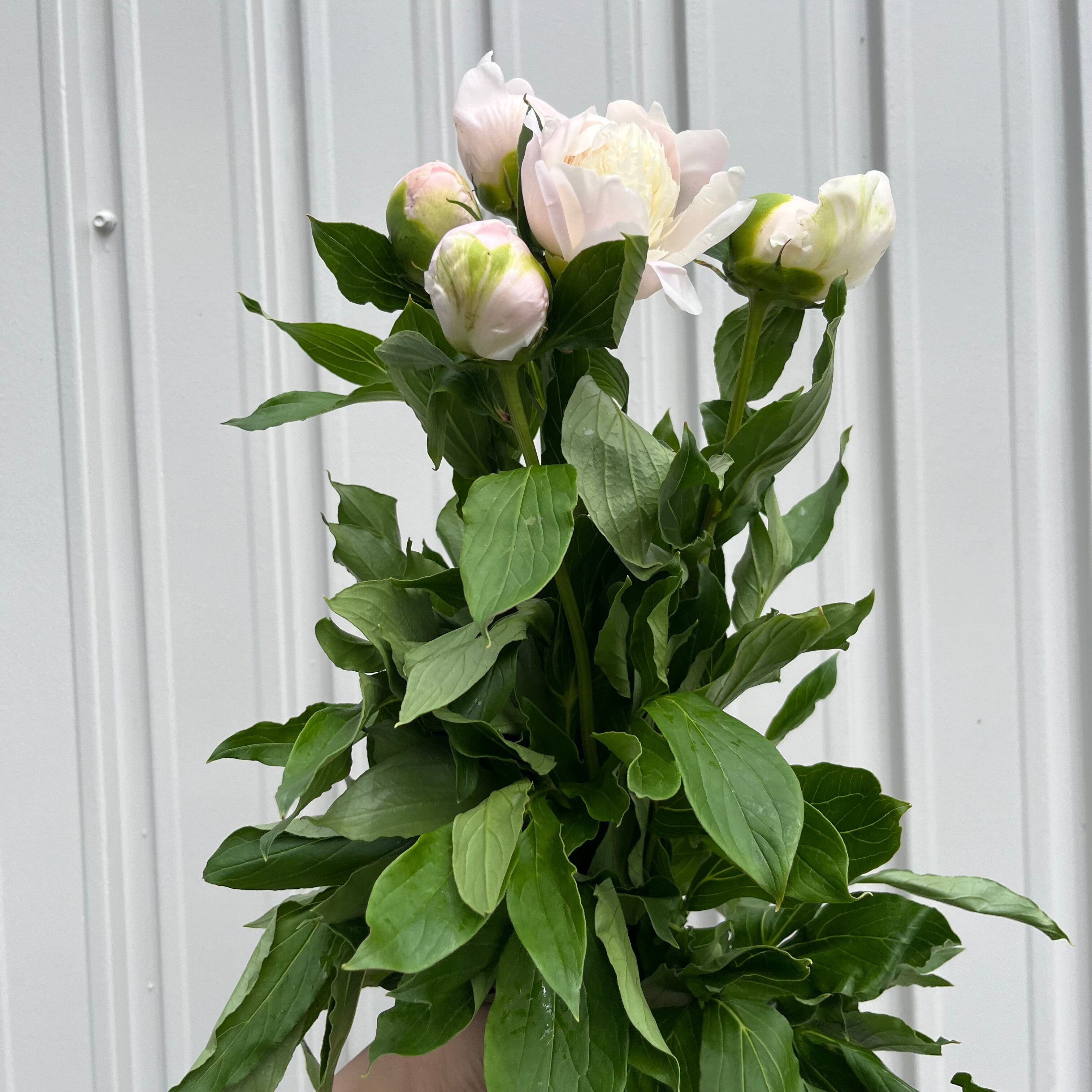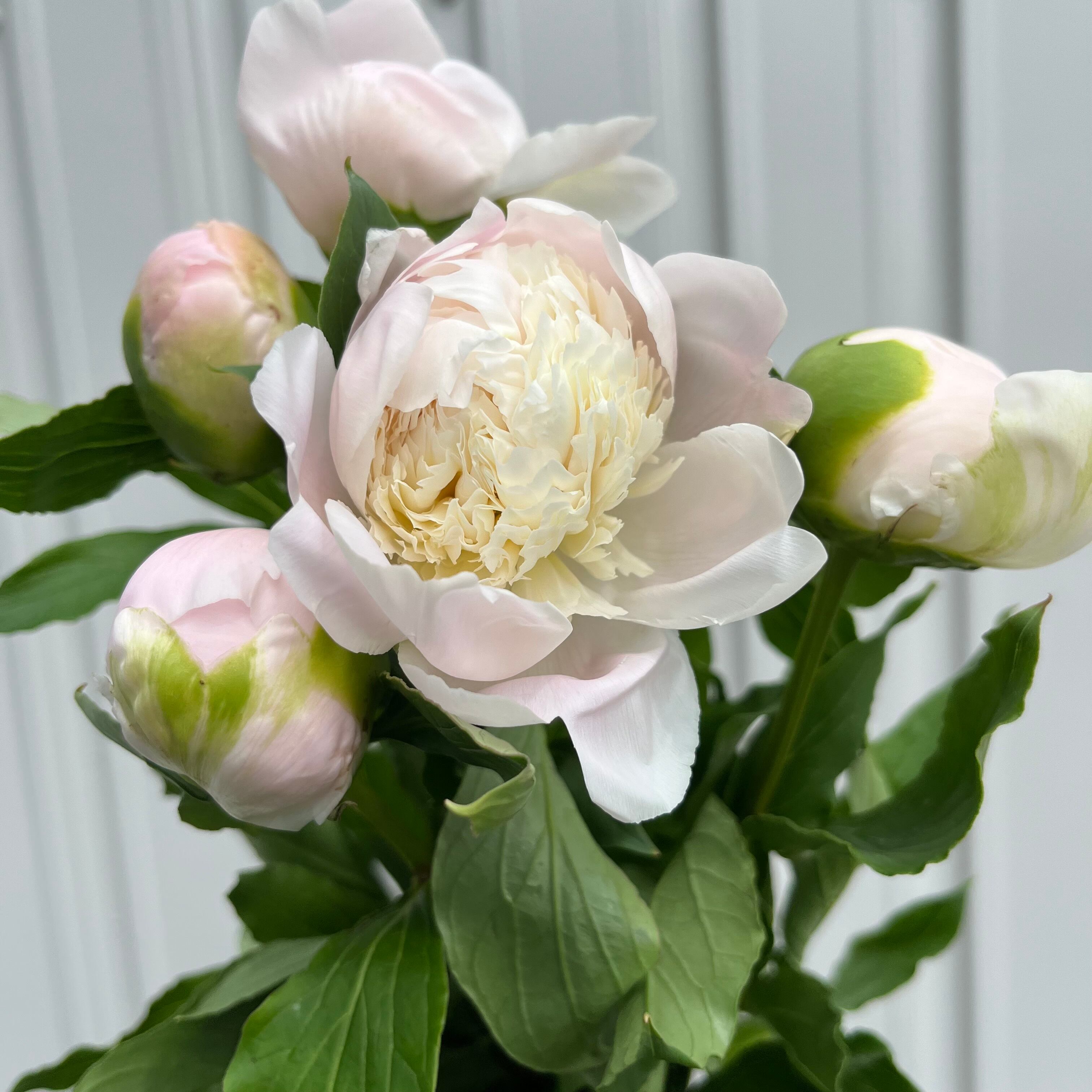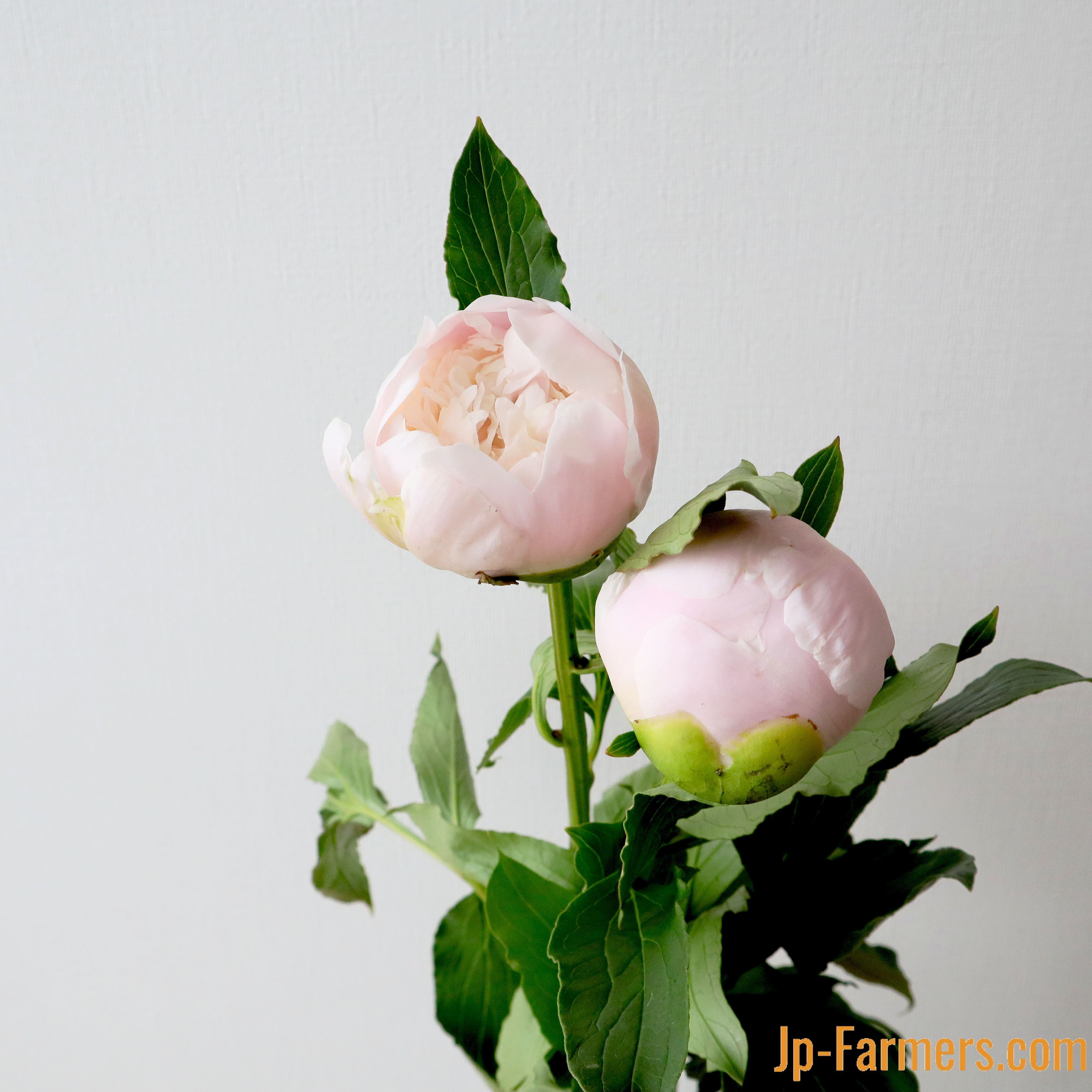 芍薬は水あげが少し苦手なお花です。葉っぱが沢山ついていると、水分が蒸散の方が多くなりお花まで十分な水が供給し辛くなります。適度(蕾から2節程度を残し取り除く事が理想)に葉を取り除いて、あげてください。