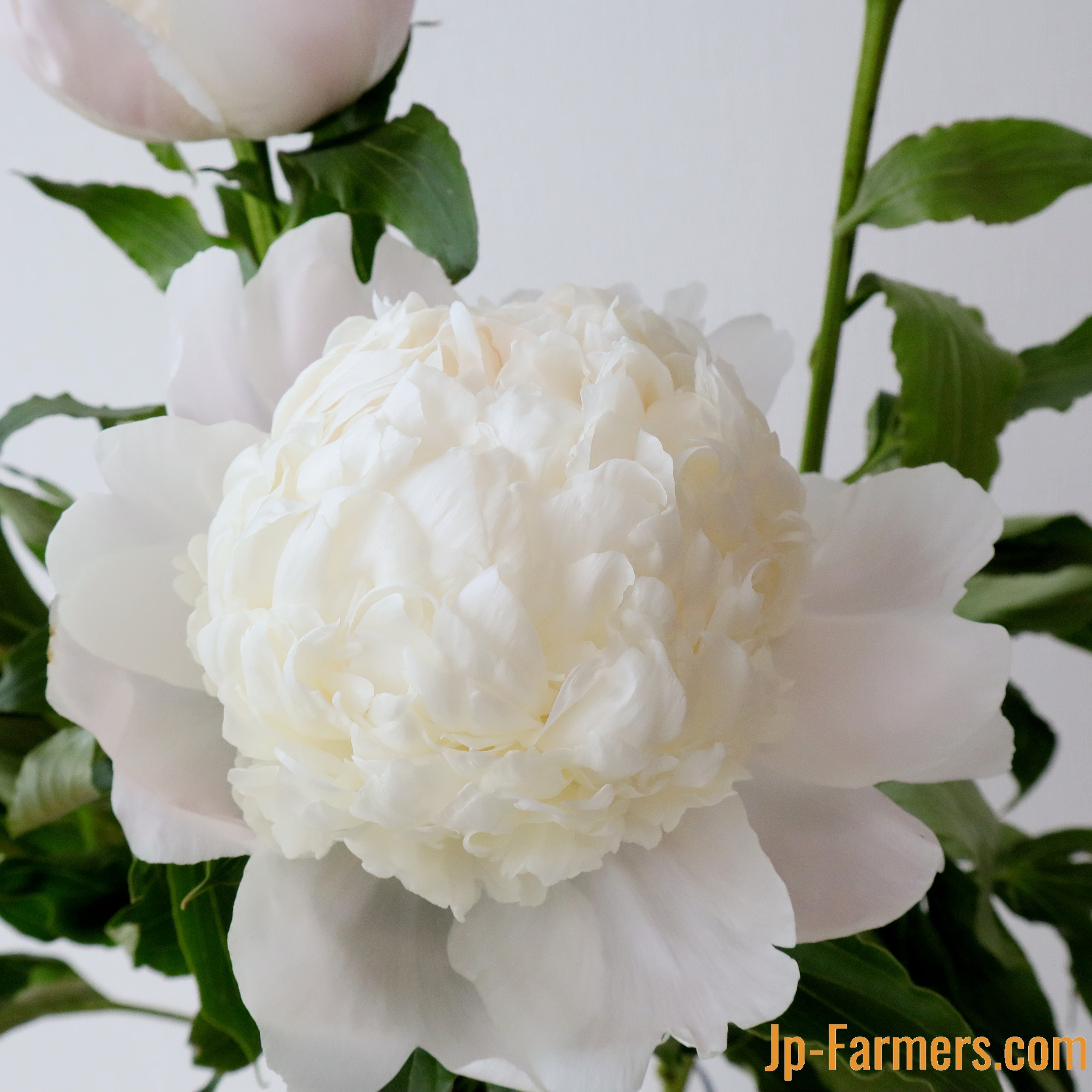 豪華な白色八重咲き『三礼加』のご紹介です。「みらいか」と読みます。蕾の時は薄いピンクにも見えますが、開花が進むにつれてとてもエレガントな白色になります。甘い香りも漂う、季節のお花です。開花の姿は、外弁が開くと中の花弁は大きな球体のように立体的でとても豪華な品種です。