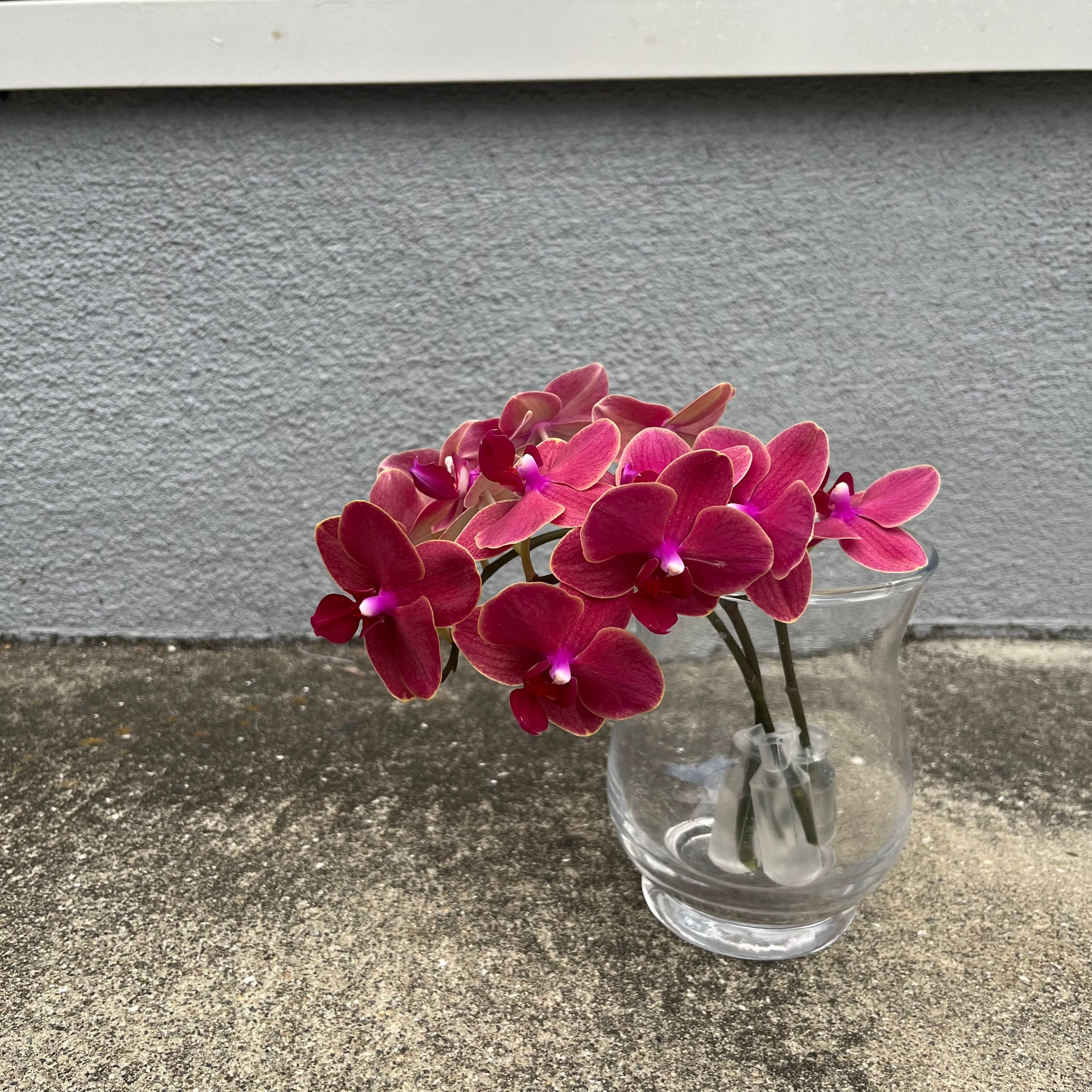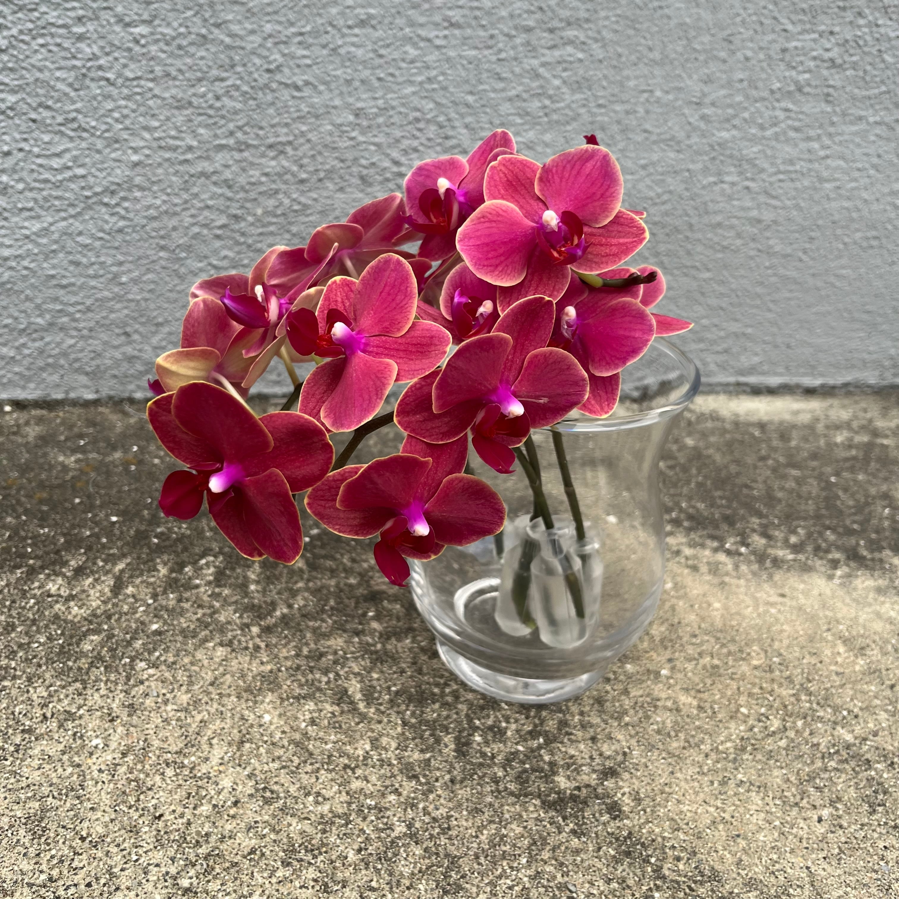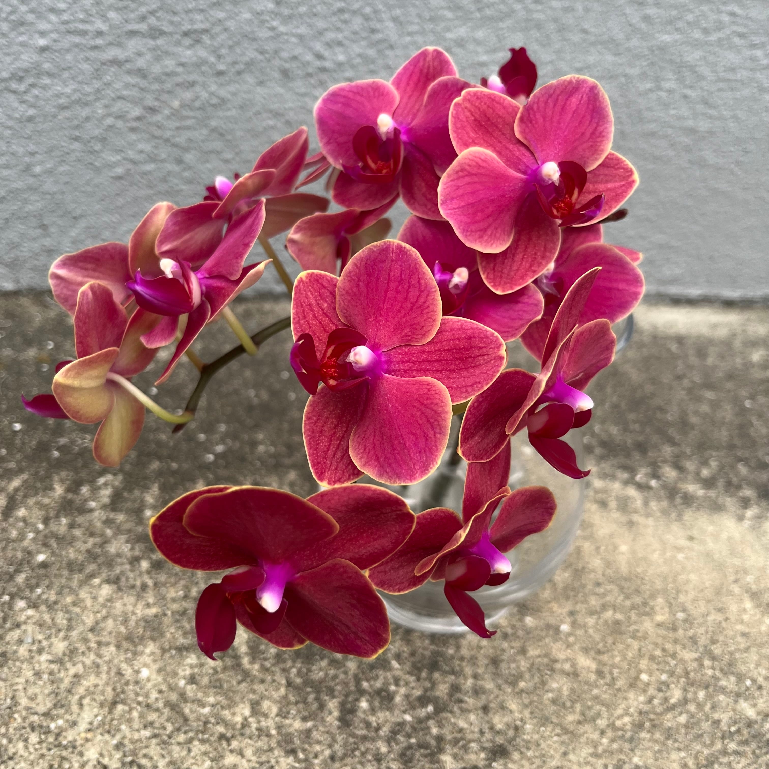 小輪の胡蝶蘭です。茜色に近い濃いピンク色とうっすら黄色がかった花をしています。