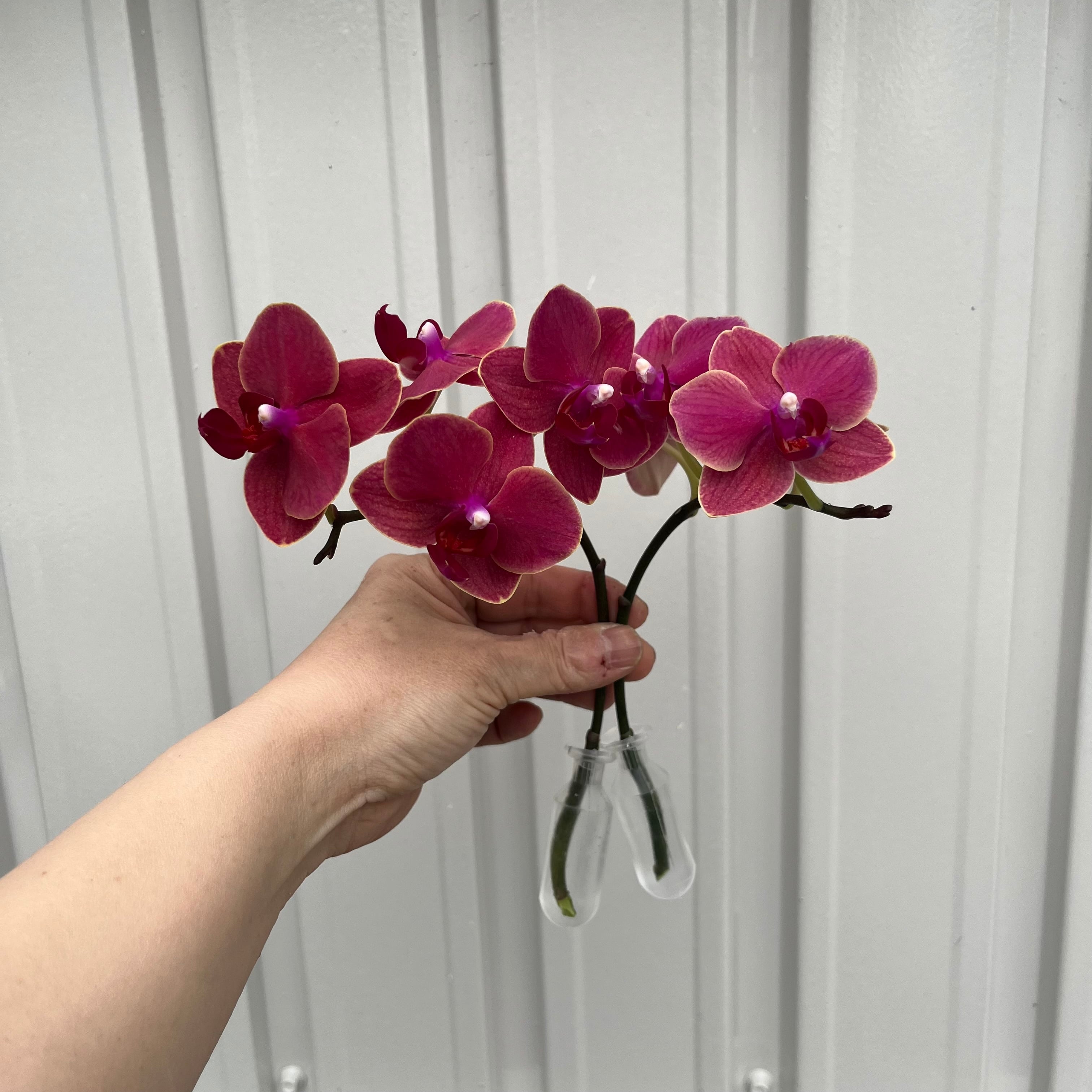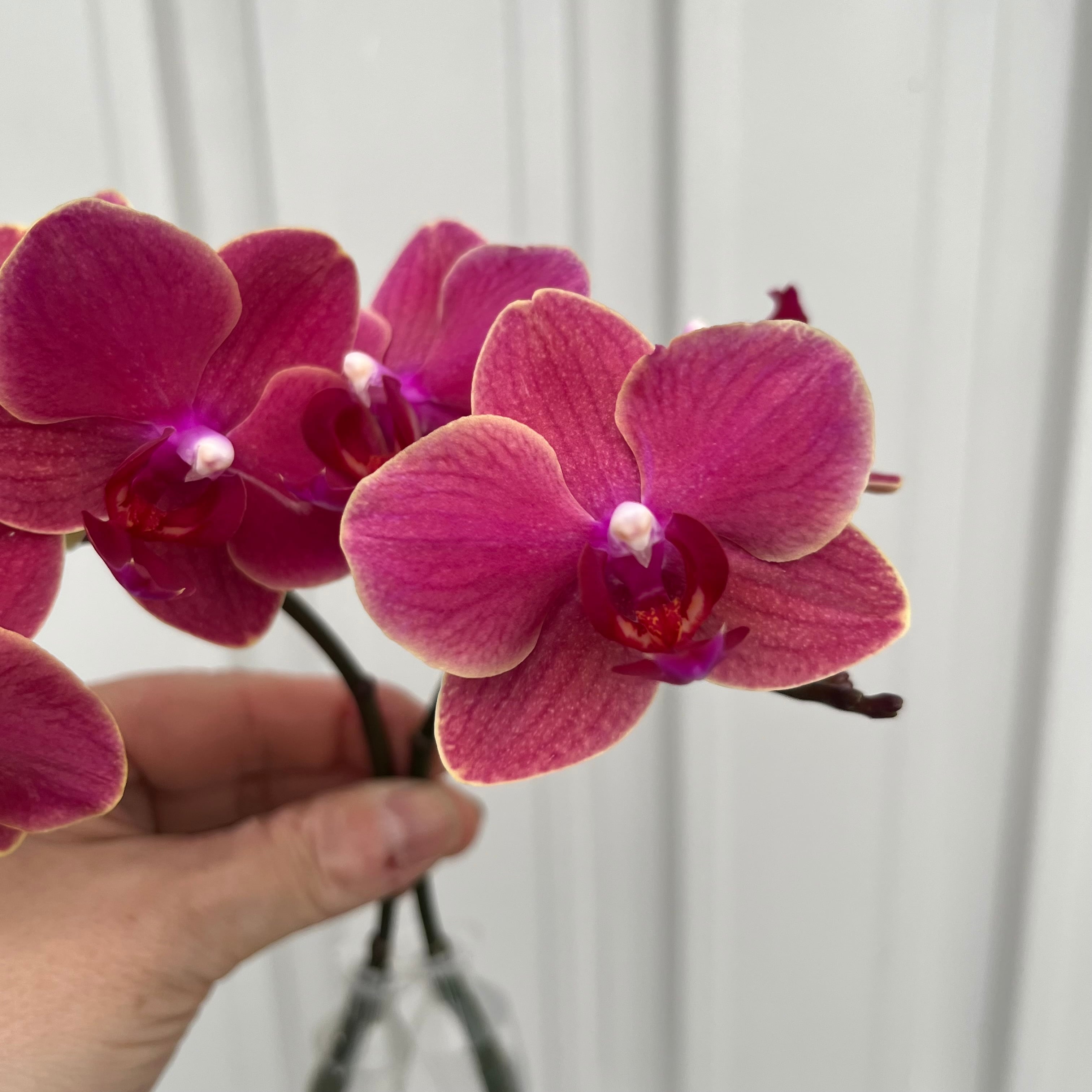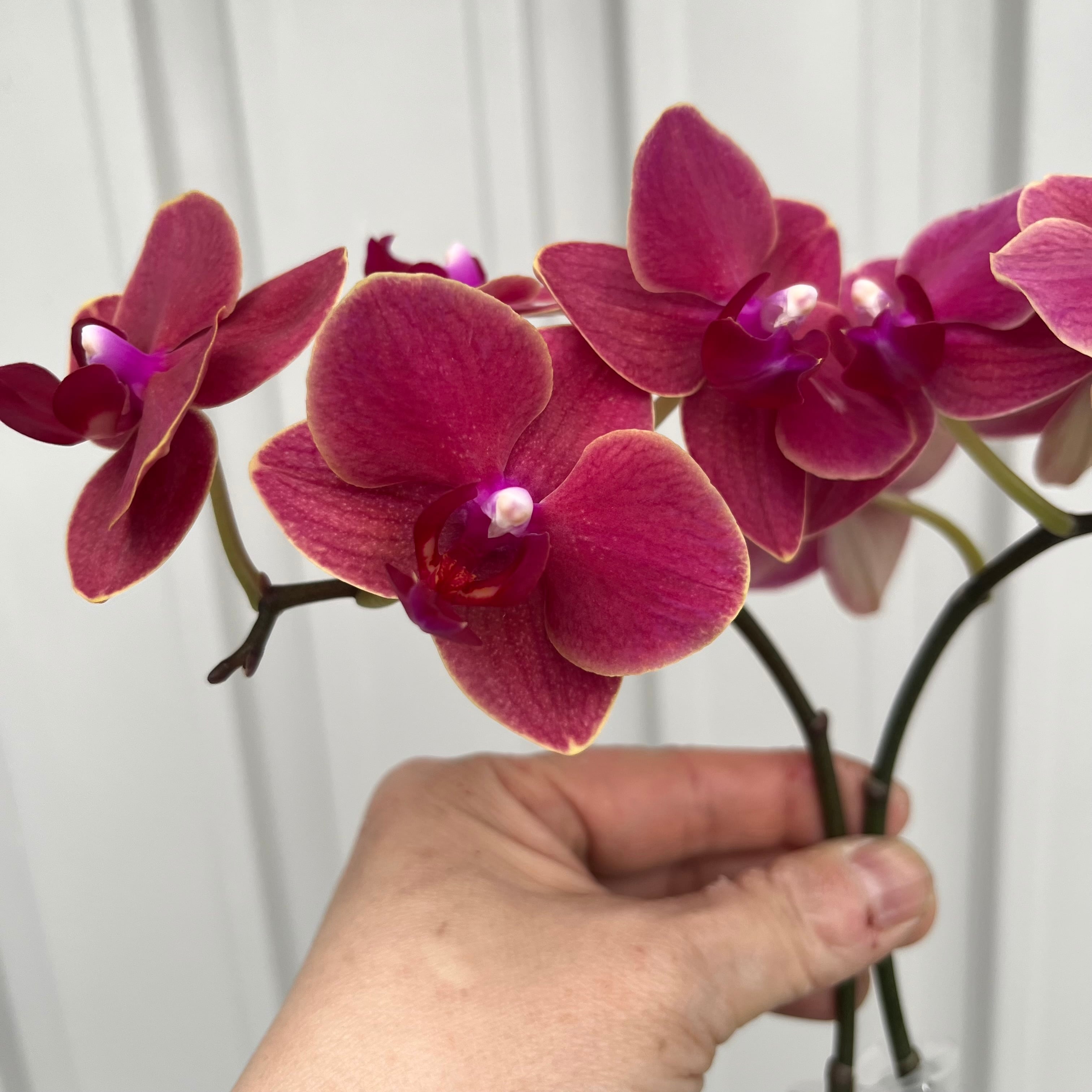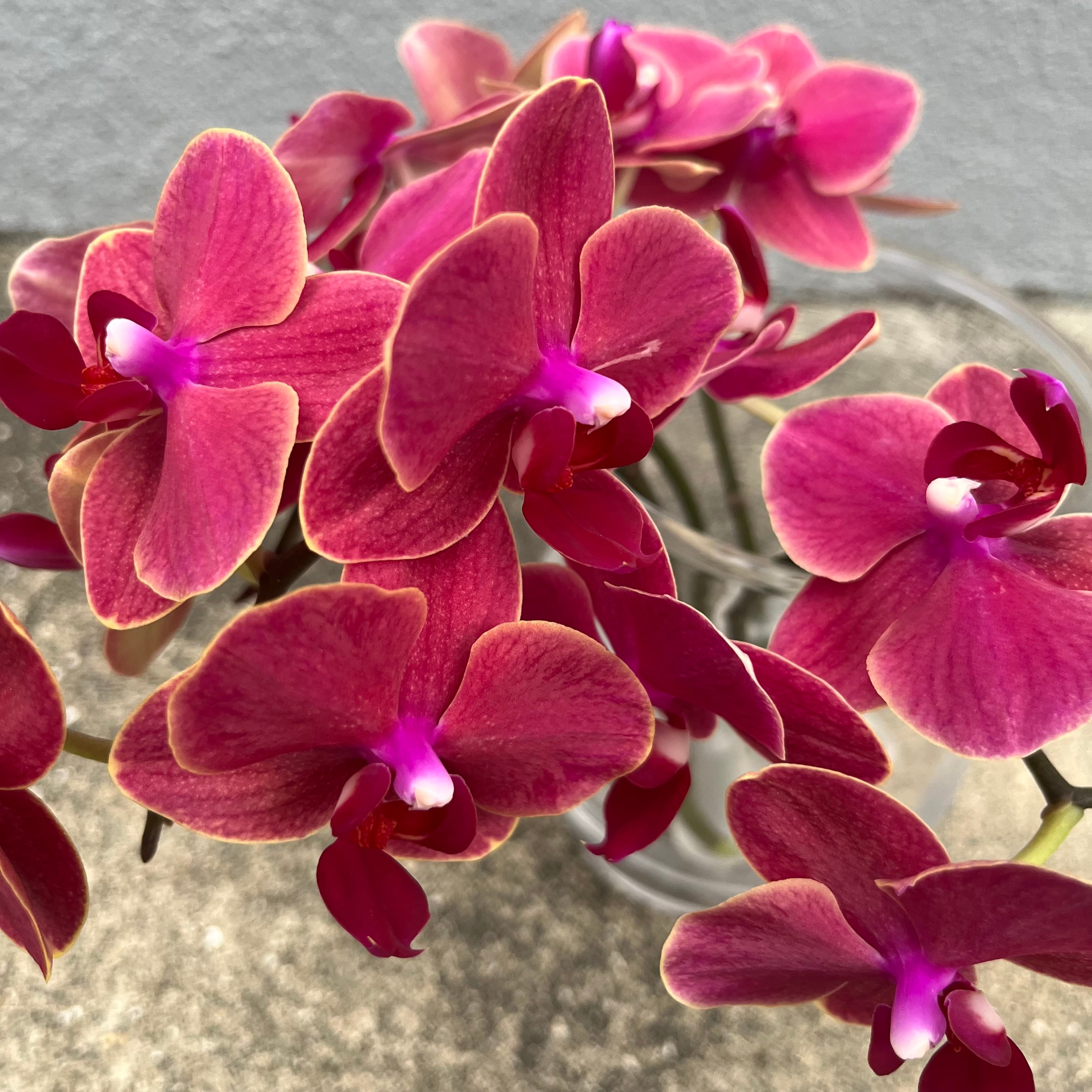 小輪の胡蝶蘭です。茜色に近い濃いピンク色とうっすら黄色がかった花をしています。