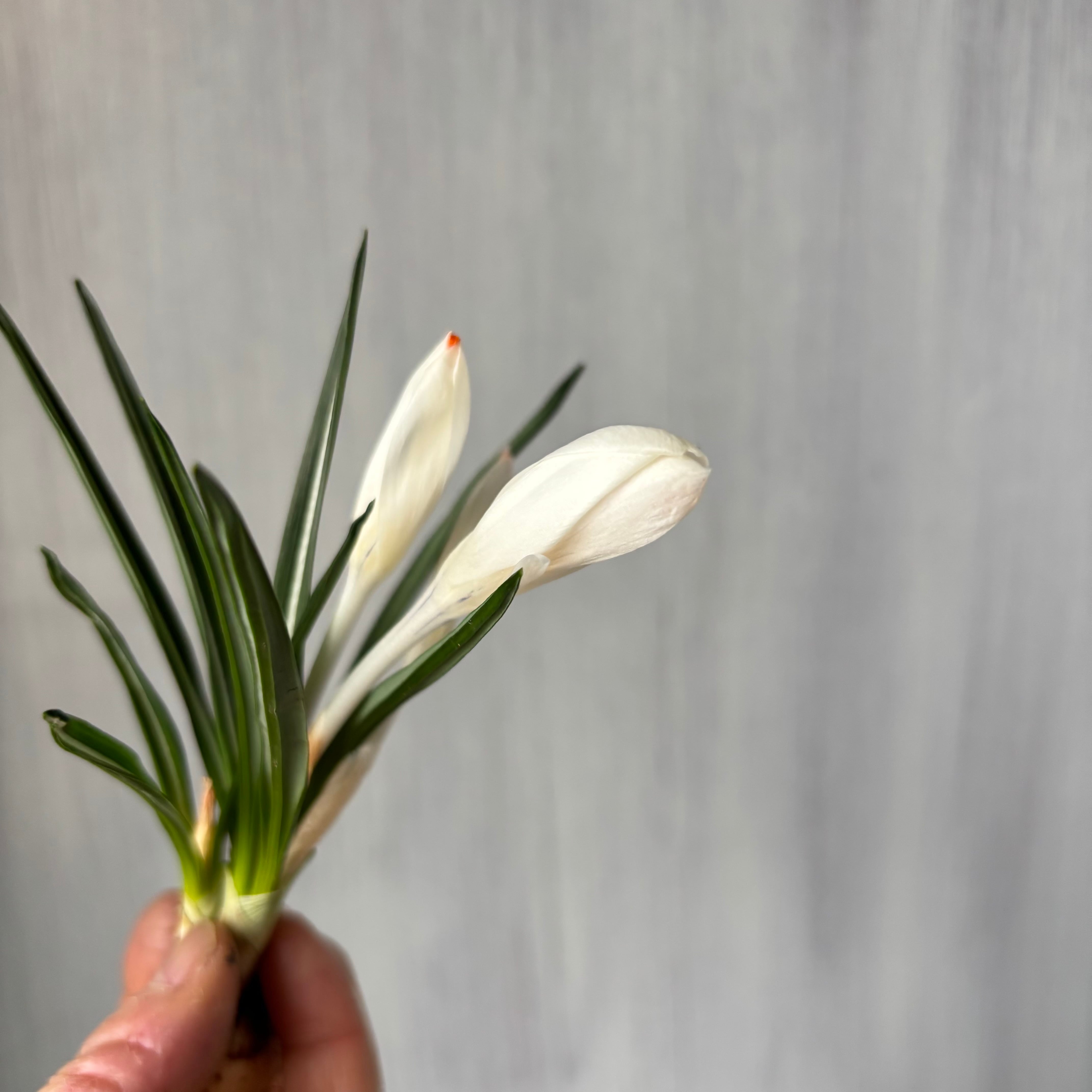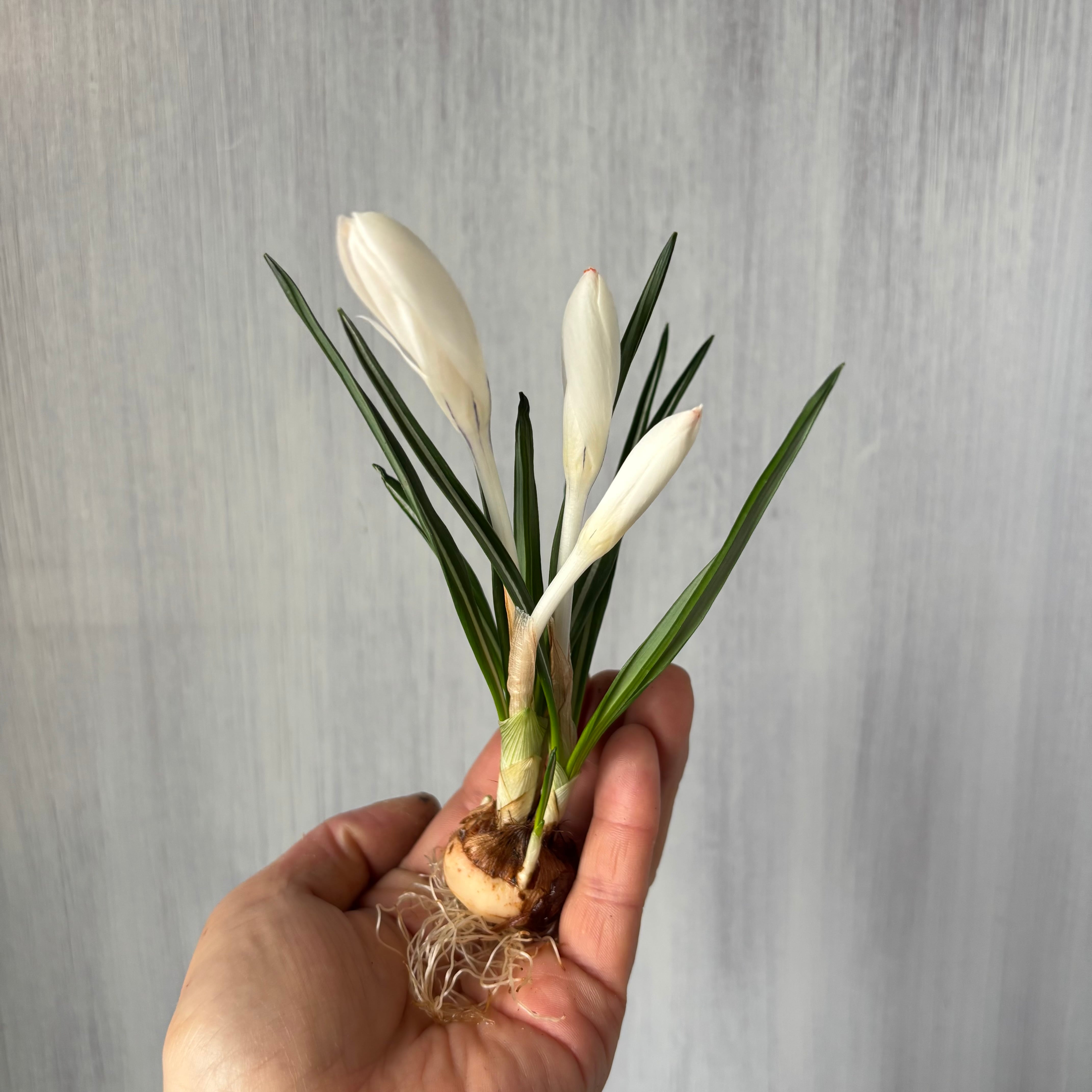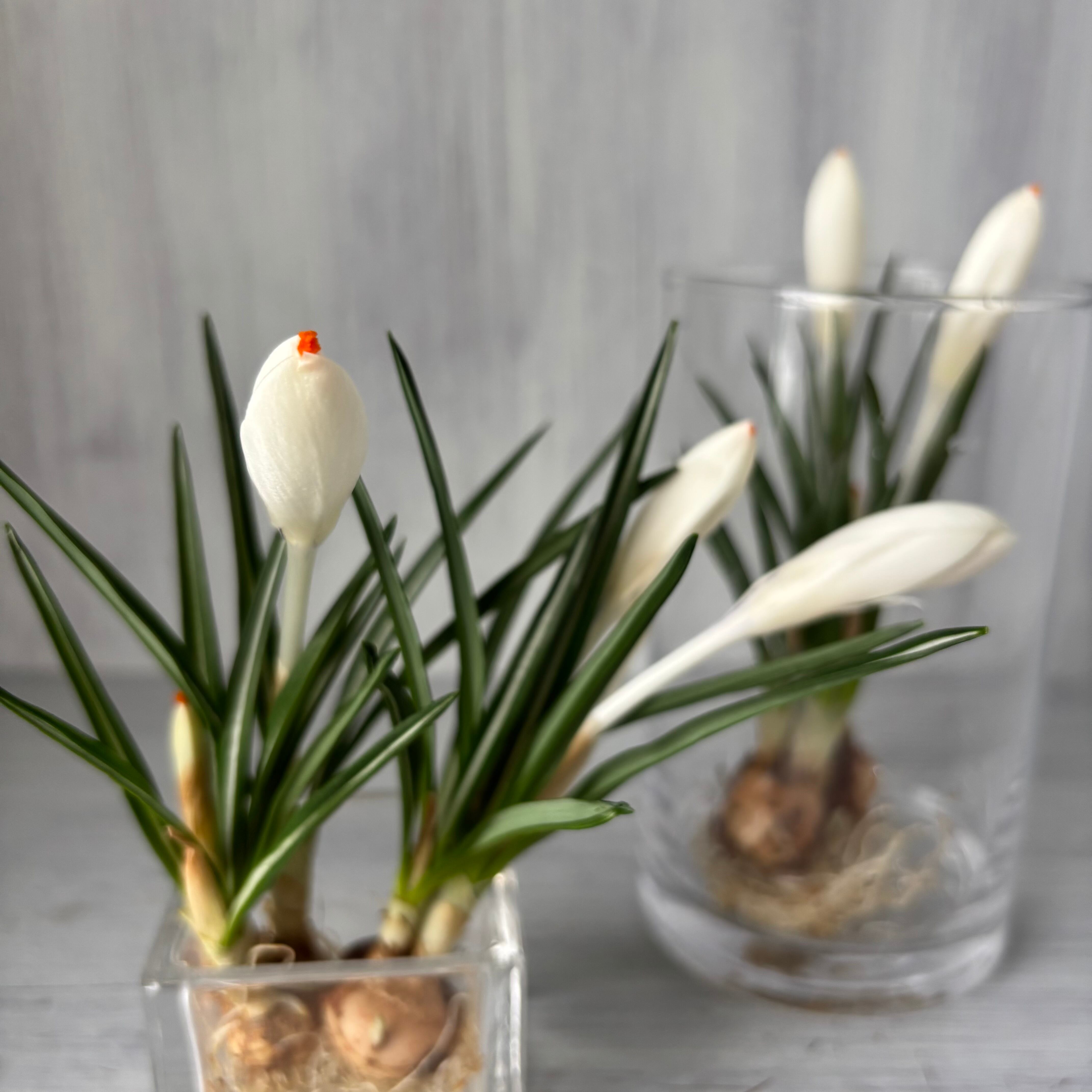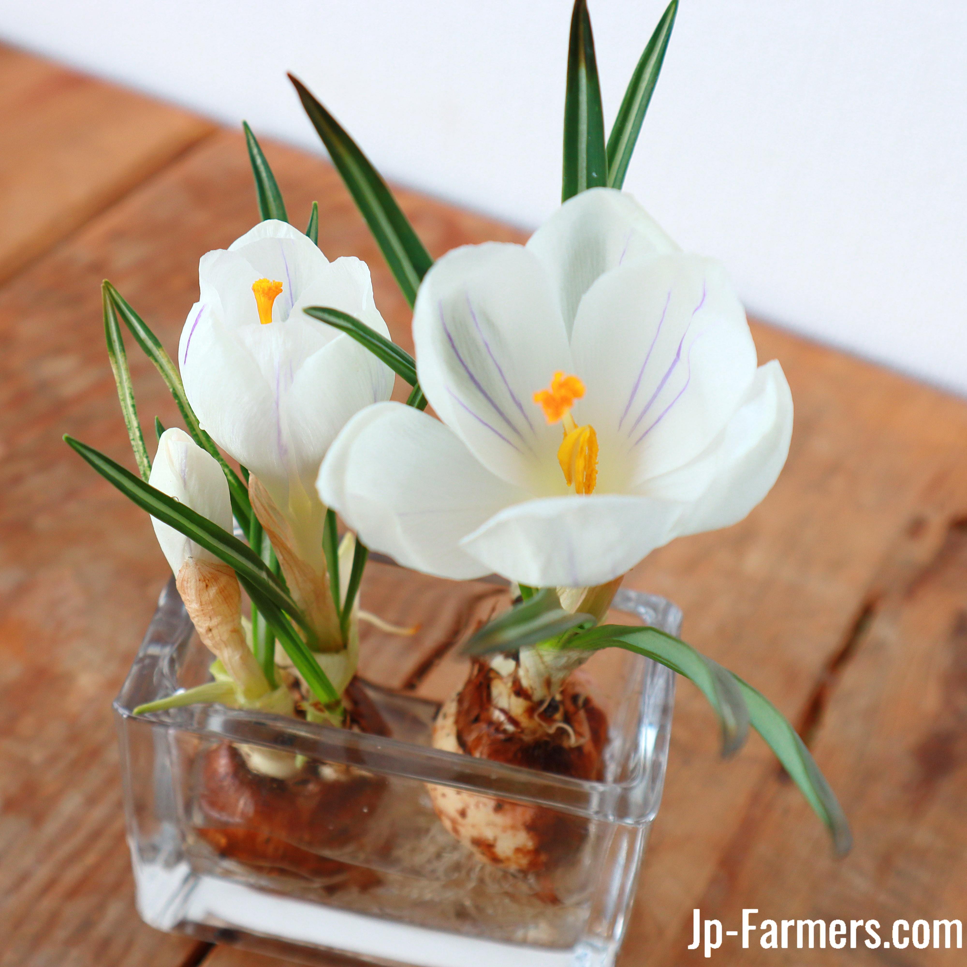 球根付きクロッカスは、ガラスの器に水を張ってそっと並べれば、水耕栽培のようにつぼみから開花までを長い時間をかけて楽しめます。