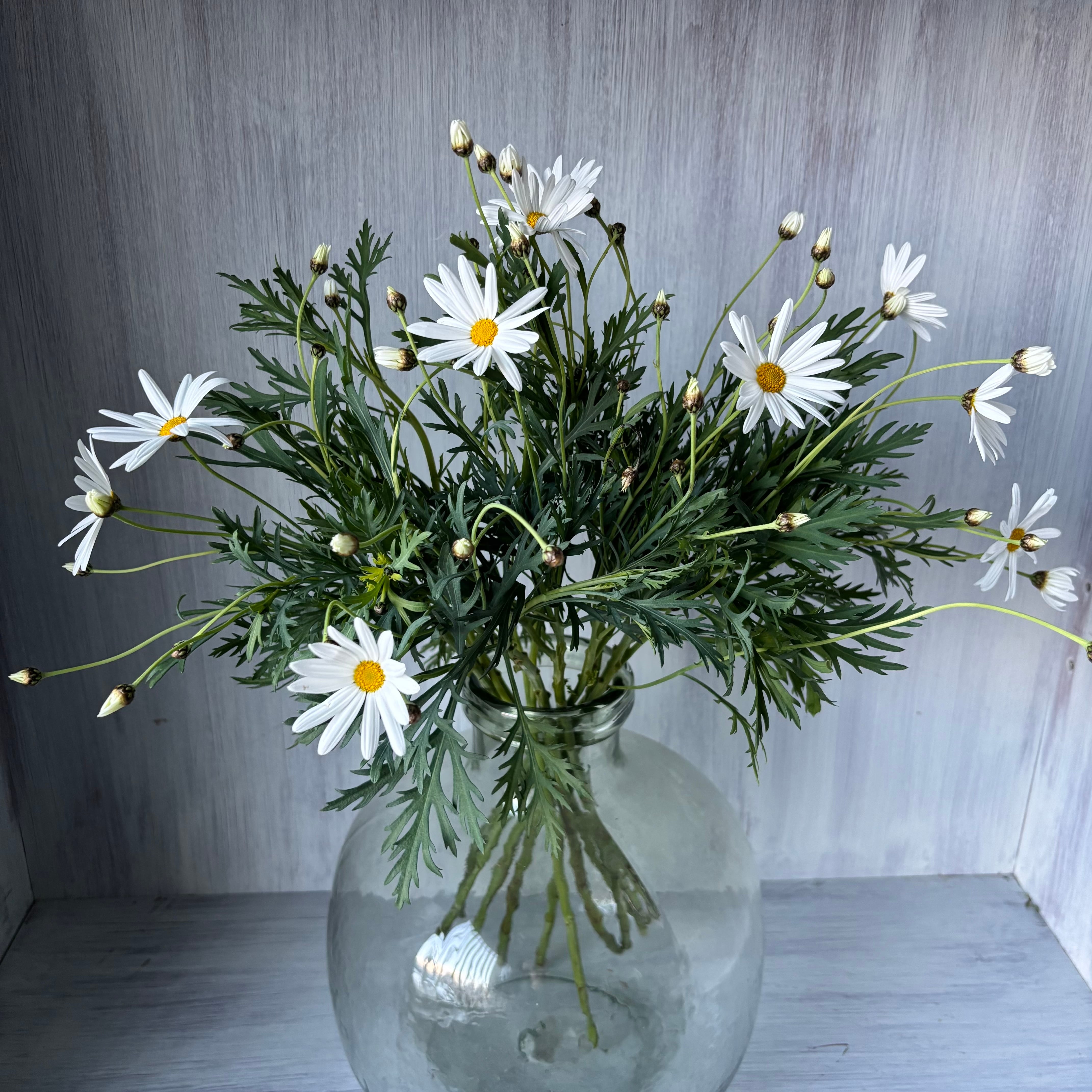 今回お届けのマーガレットは、糸のような極端に細い葉をもつ品種で、清らかで繊細、可憐な印象です。蕾もたくさんついています。